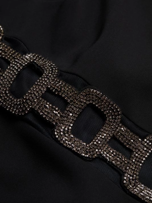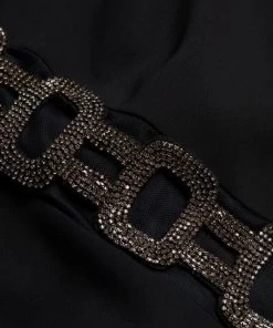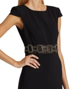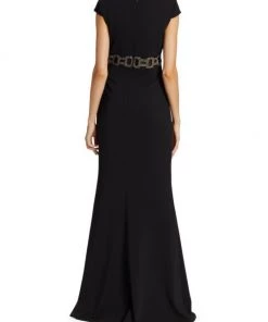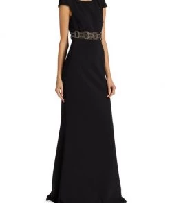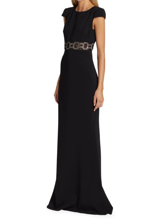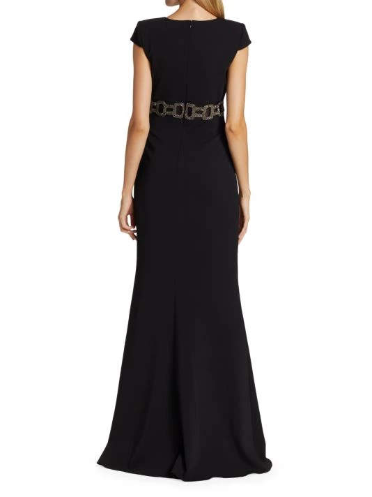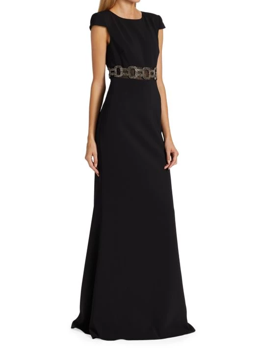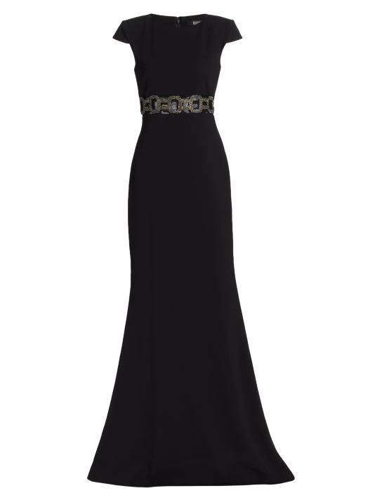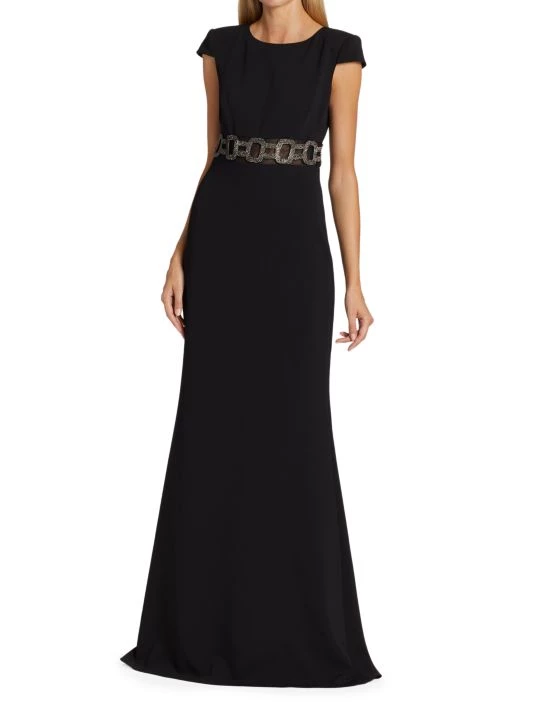 Sweeping trumpet silhouetted gown framed with demure cap-sleeves with beaded belt detail at the waist.