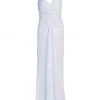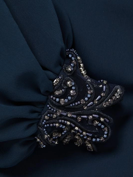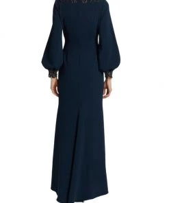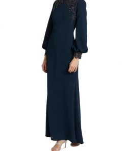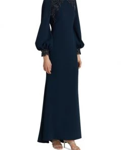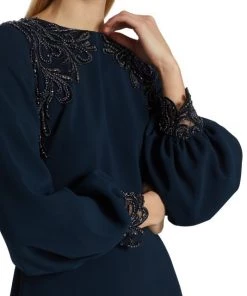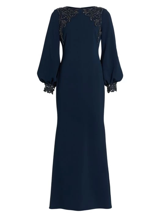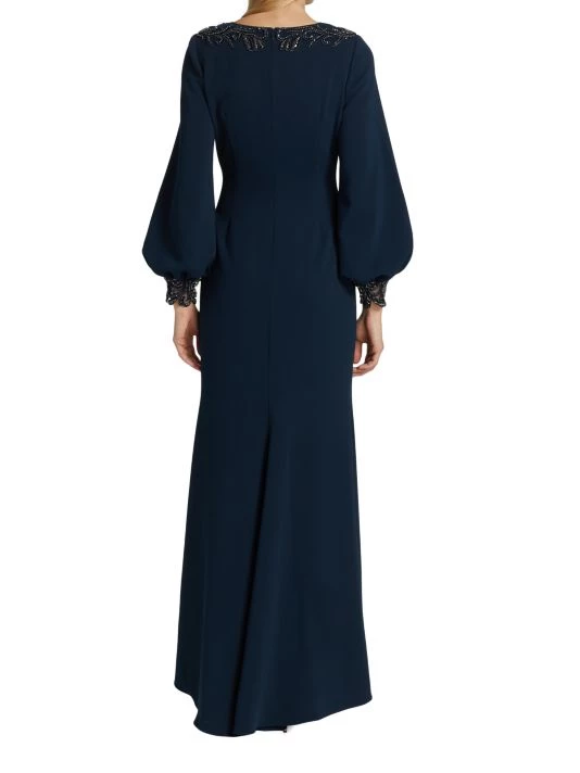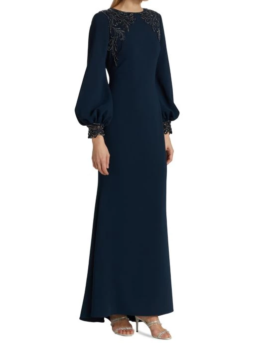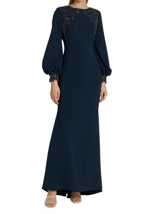 ONLY AT SAKS. Made of stretch crepe, this long-sleeve gown is detailed with embellishments along the shoulders and sleeve cuffs.