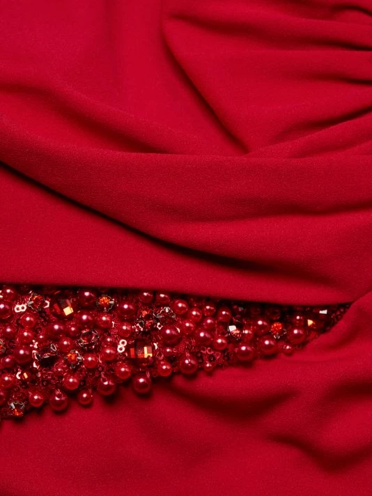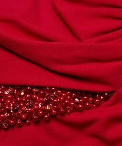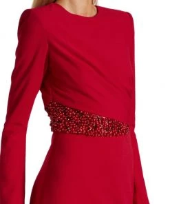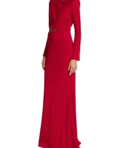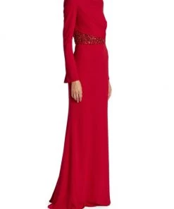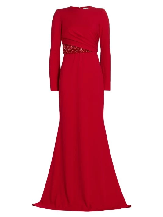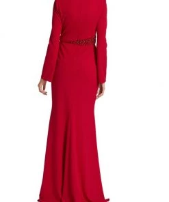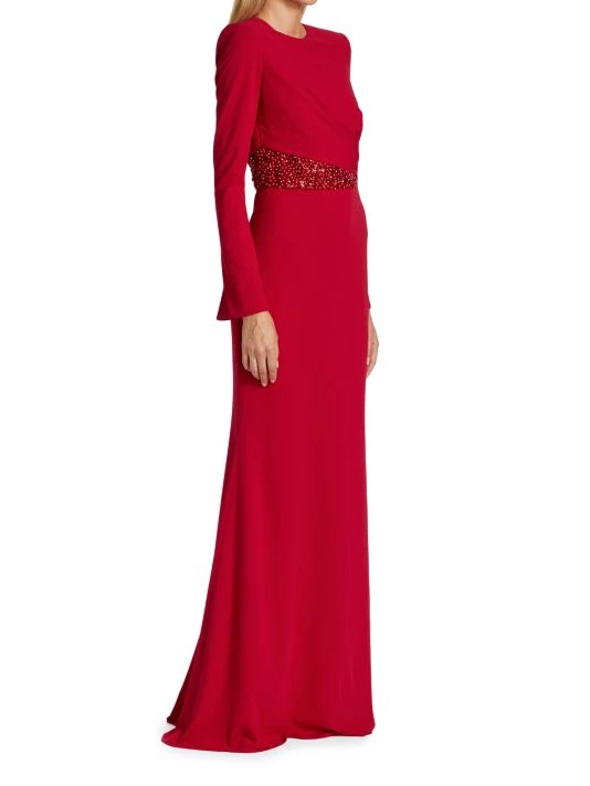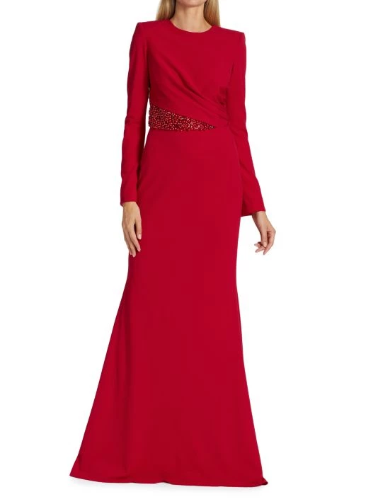 Designed in a floor length, this long sleeve gown is decorated with sparkling beaded details at the waist.
