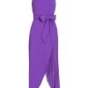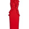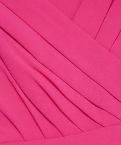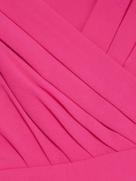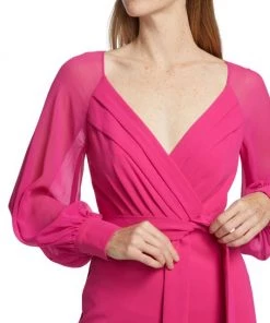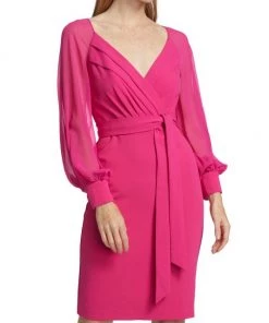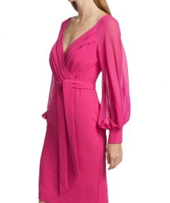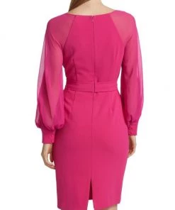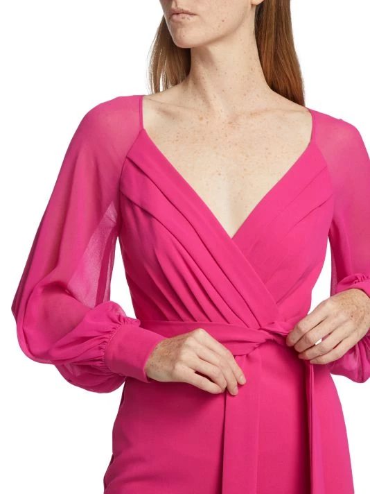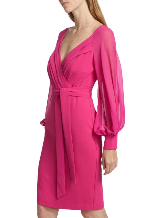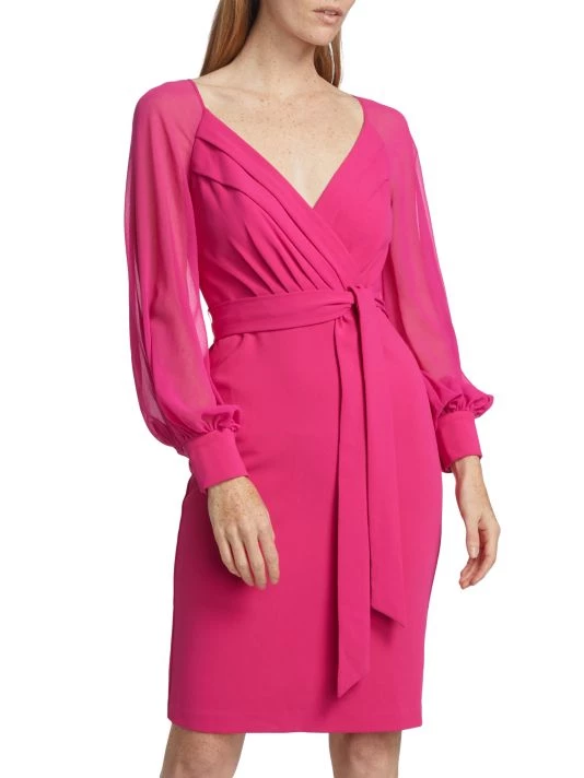 This Badgley Mischka cocktail dress features a pleated V-neck bodice with a matching self-tie belt. Sheer bishop sleeves with button cuffs complete this fitted style.