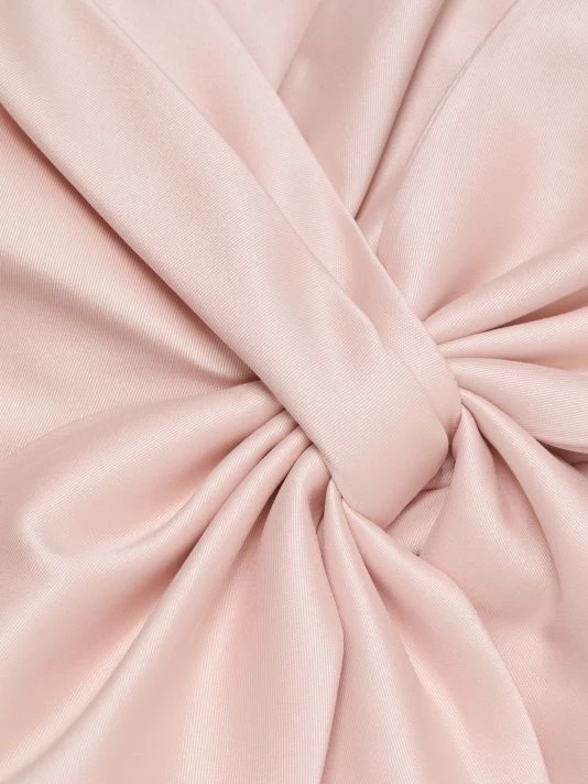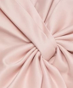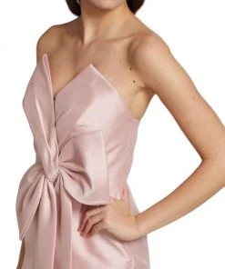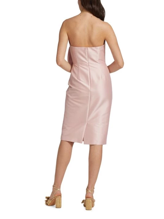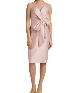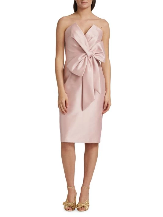 This cocktail dress from Badgley Mischka is crafted of shiny satin with a bow accent at the bodice.