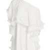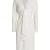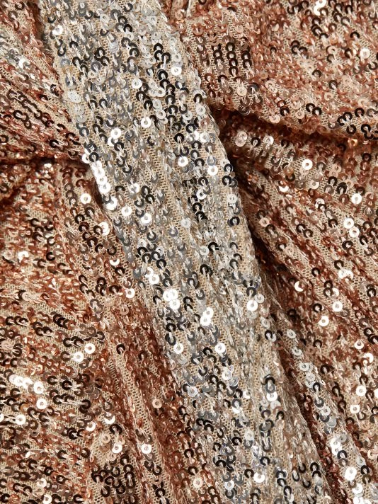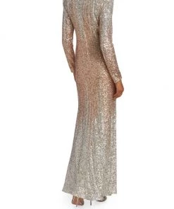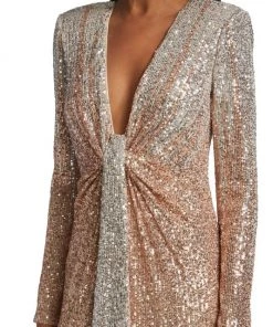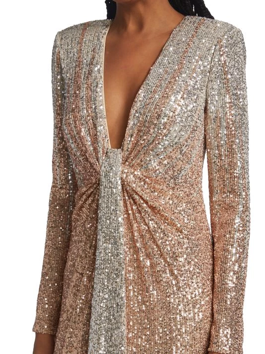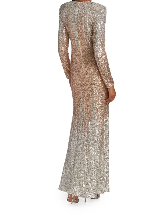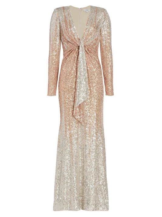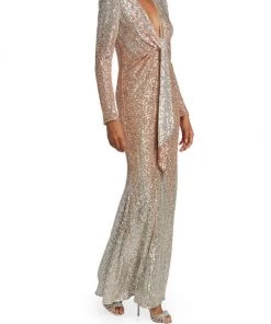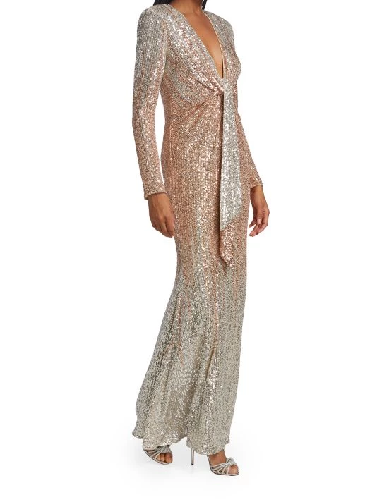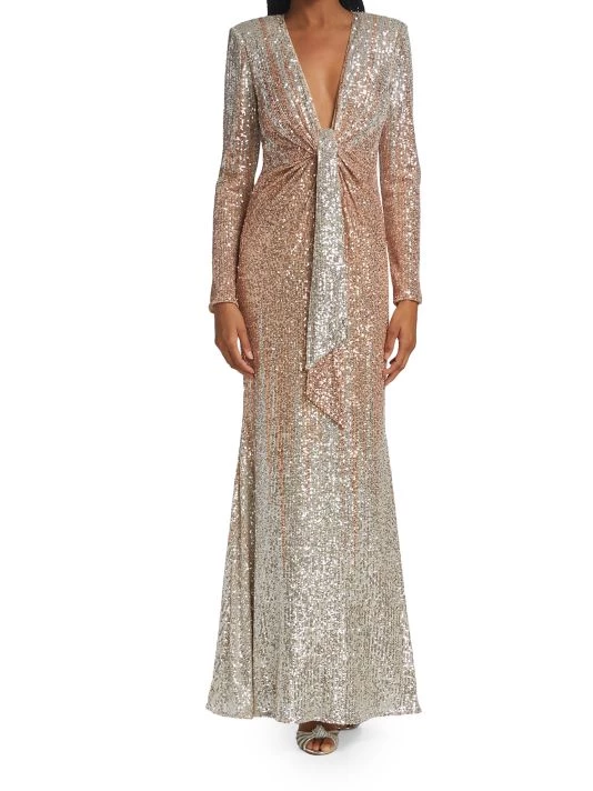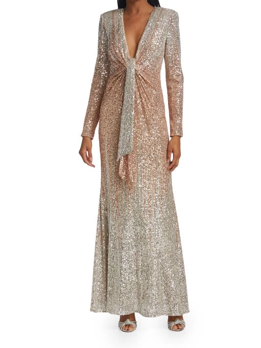 This metallic gown is designed with a deep V-neckline with a draped fabric detail at the center.