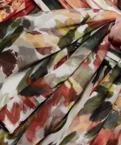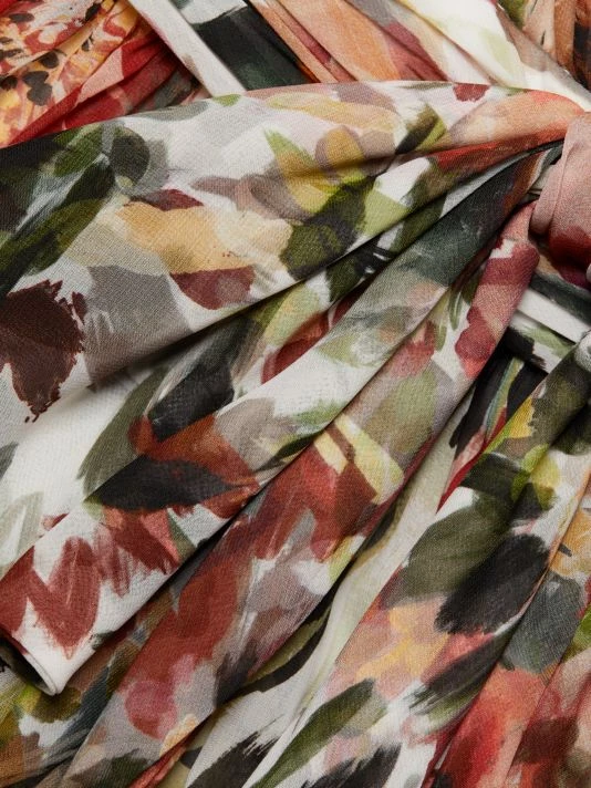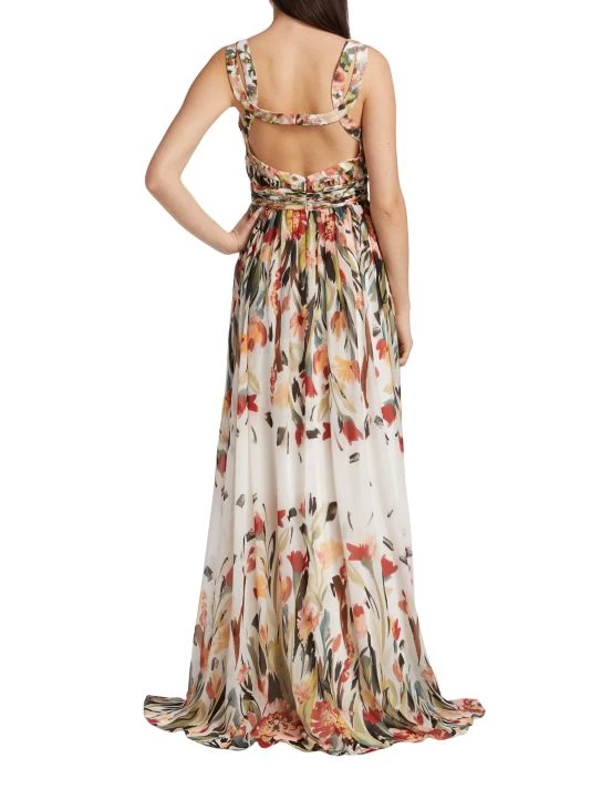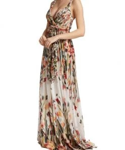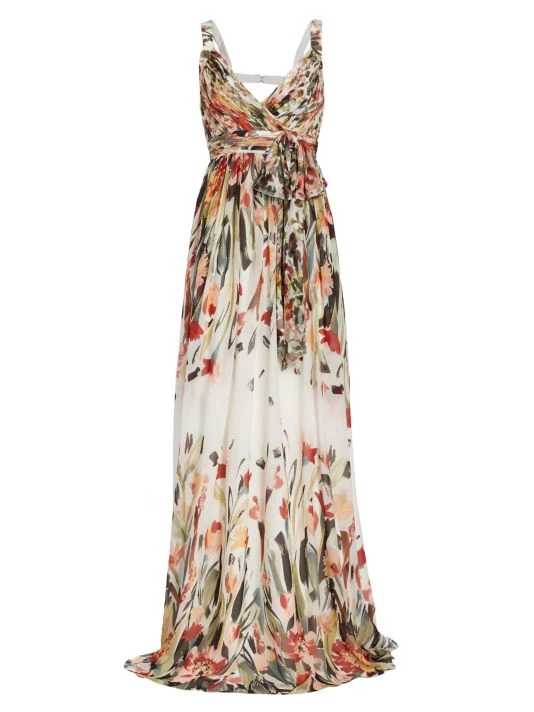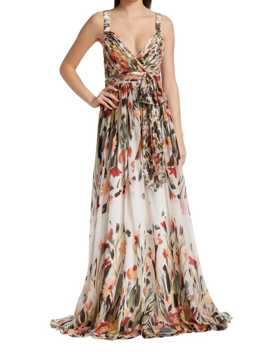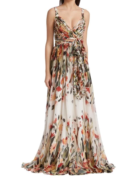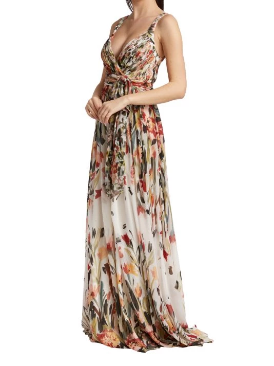 Tied together with a bow accent at the waist, this prettty draped gown features a floral print.