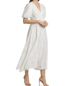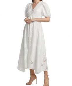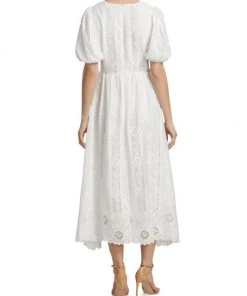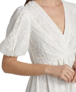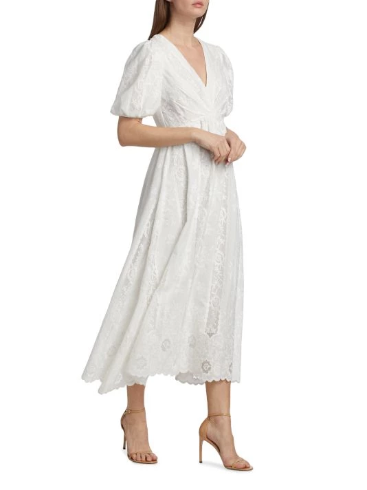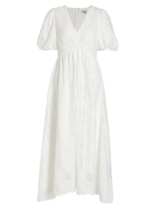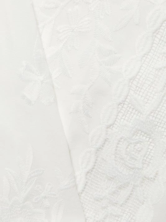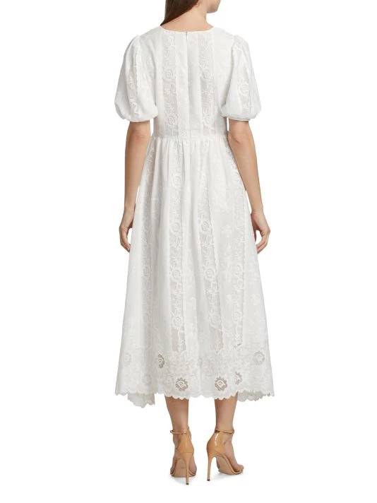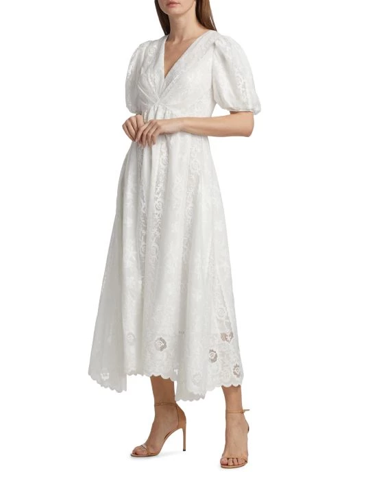 Lace detailing topped with embroidered floral details and scallop trim at the hem decorate this elegant dress.