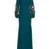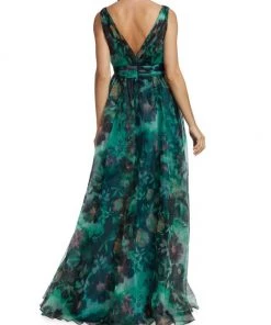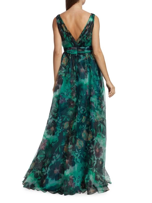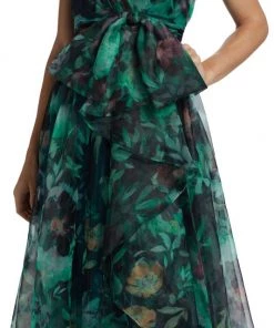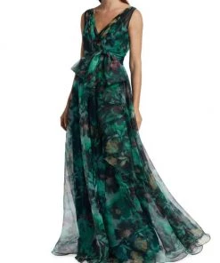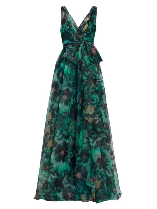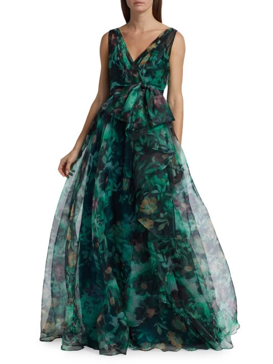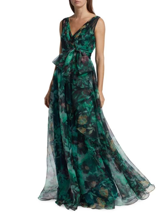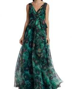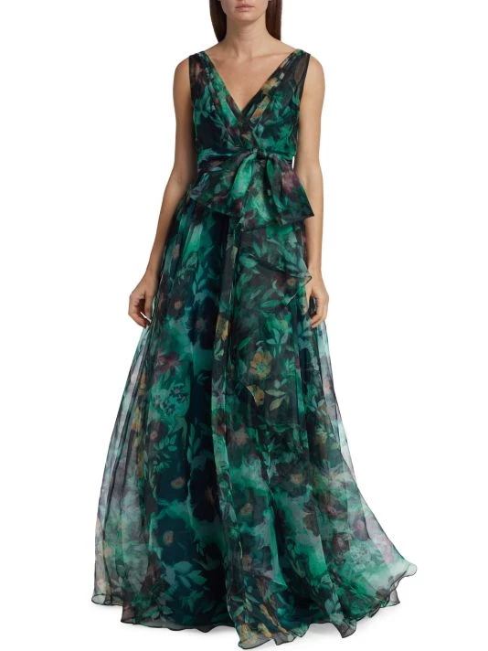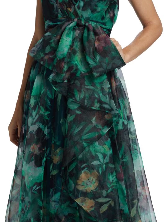 Cut in a fit-&-flare silhouette, Badgley Mischka’s floor-length gown flaunts a chic floral print. A pleated v-neck bodice and elegant oversized bow finish this style.