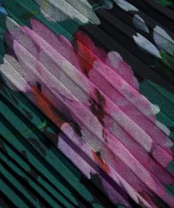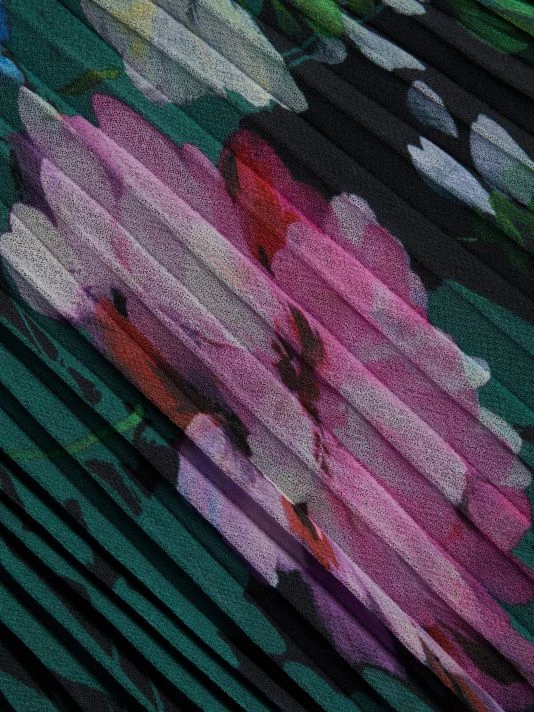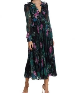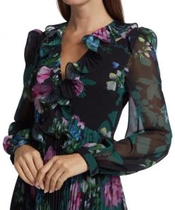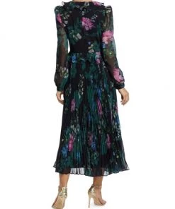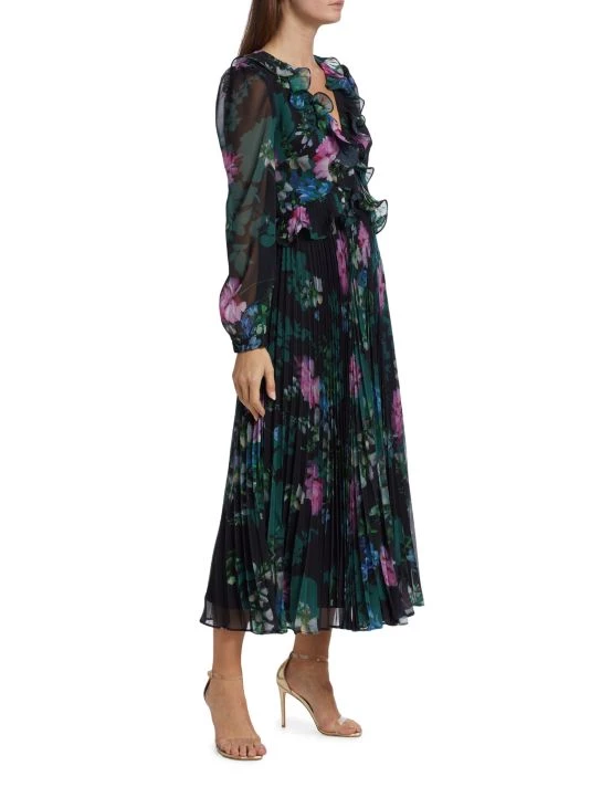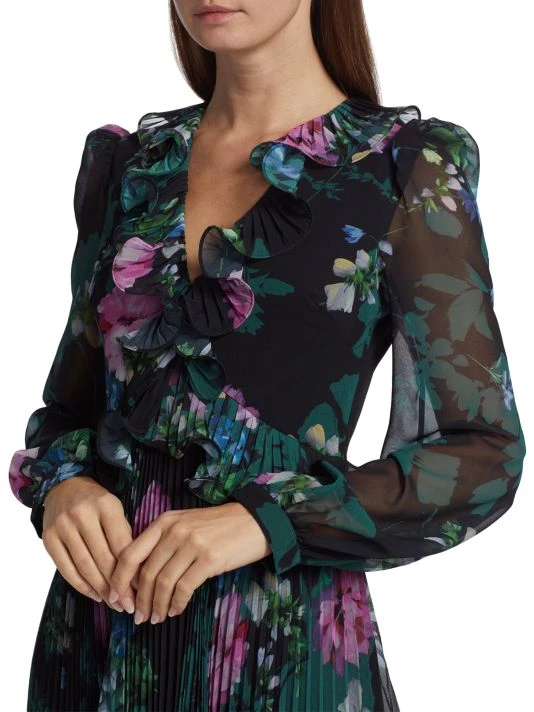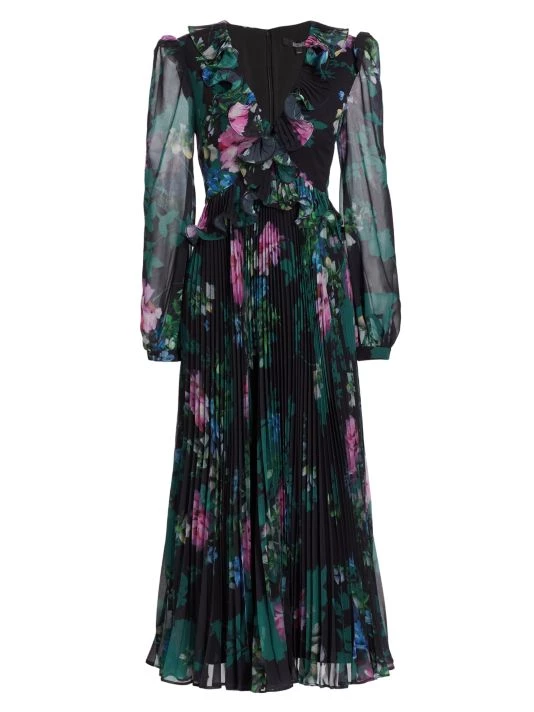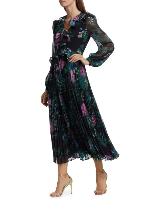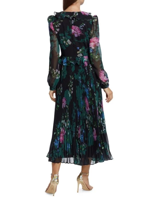 Badgley Mischka’s pleated skirt midi-dress flaunts a charming floral print and is detailed with romantic ruffle details along the neckline and waist.