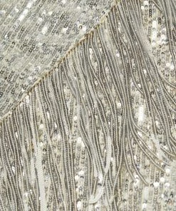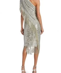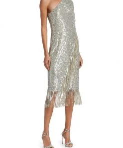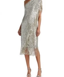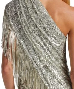 Shimmering sequins and a cascade of fringe illuminate this one-shoulder dress.
