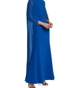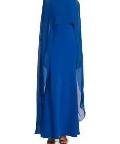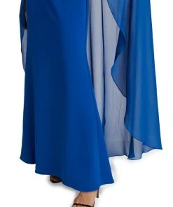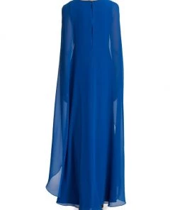 This sleek trumpet gown features a flowing sheer georgette cape overlay.