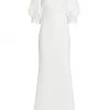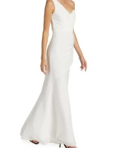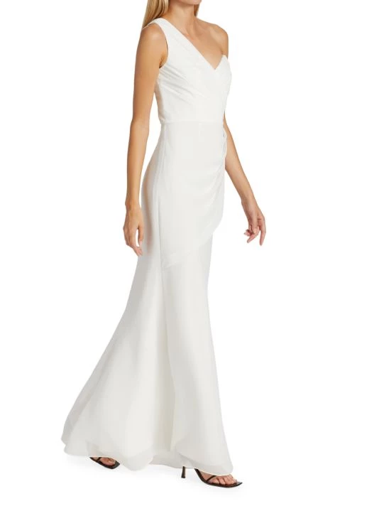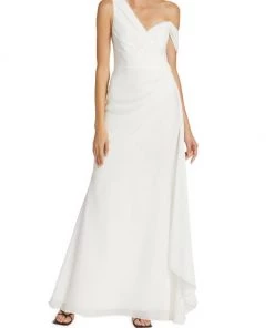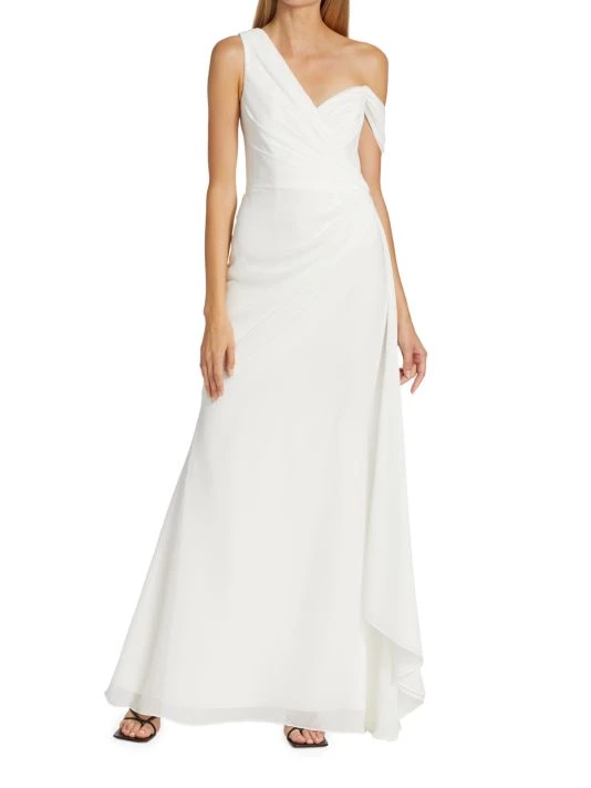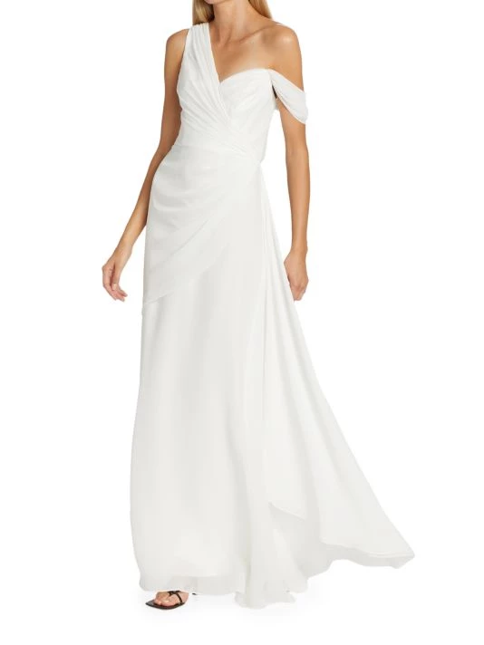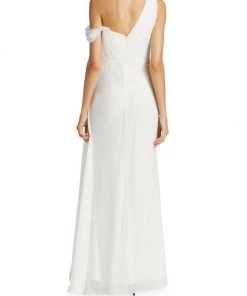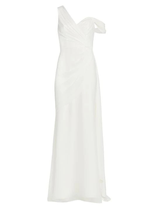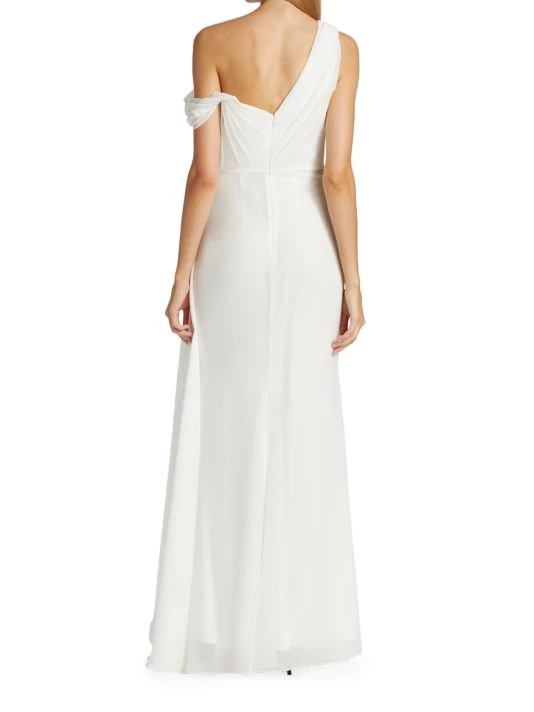 Sophisticated A-line gown gathers at the waist creating an elegant silhouette, enhanced with an off-the-shoulder style design.