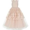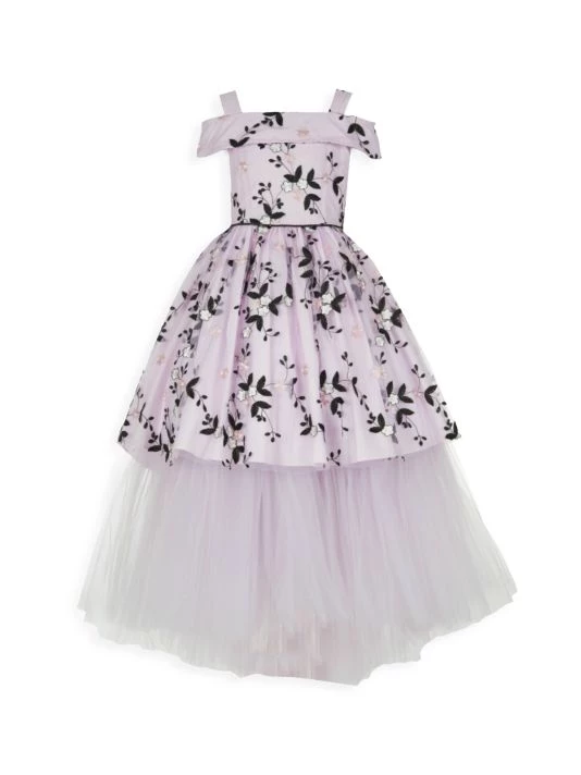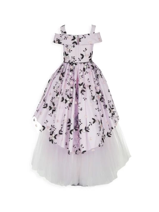 Stunning floor-length dress with floral mesh embroidery and cold-shoulder silhouette.