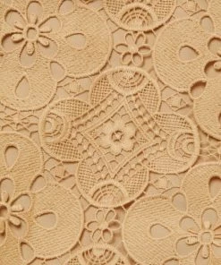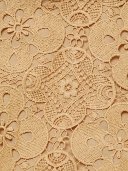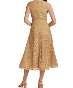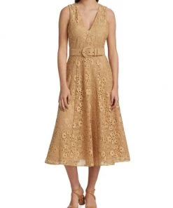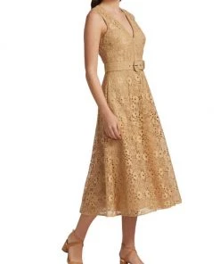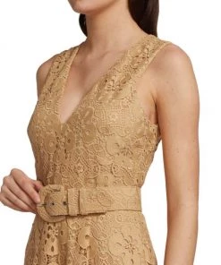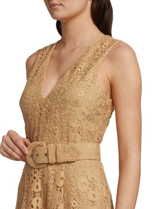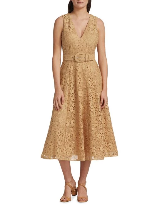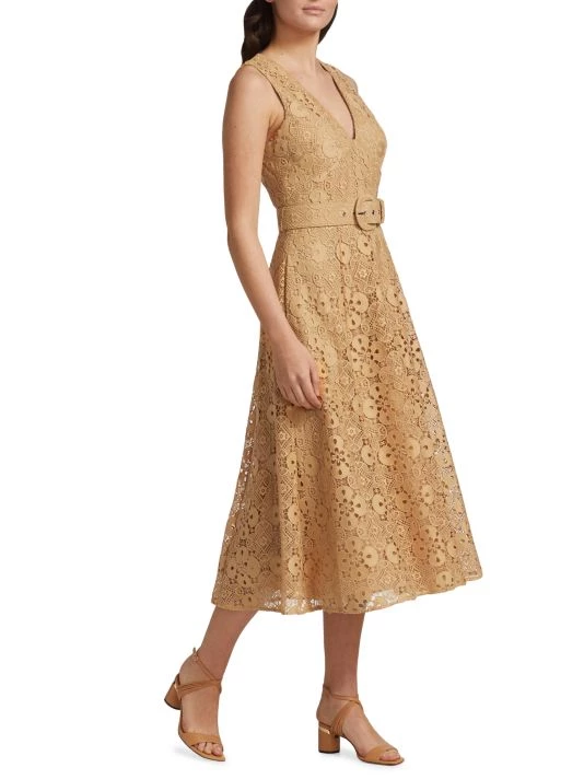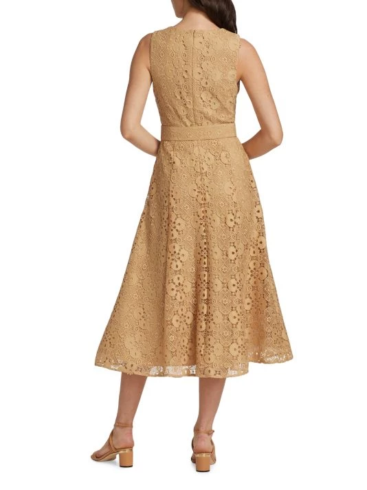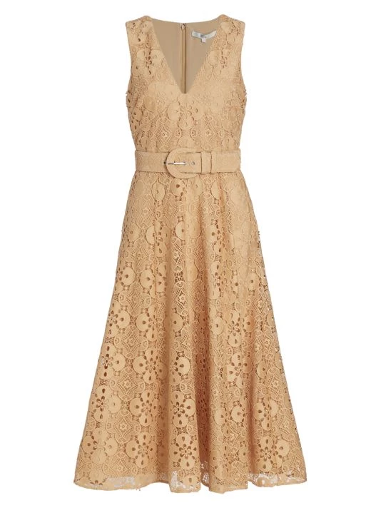 This midi-dress from Badgley Mischka is crafted of delicate lace with a removable self belt and a swingy skirt.
