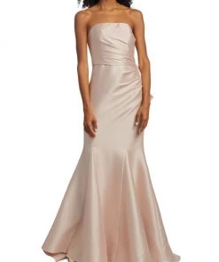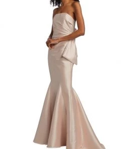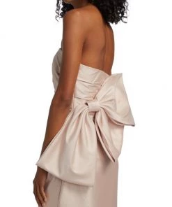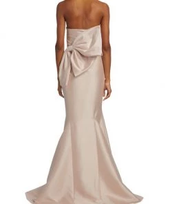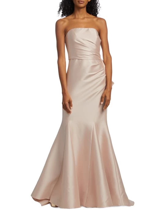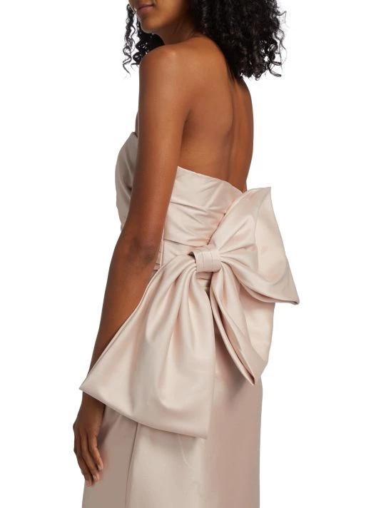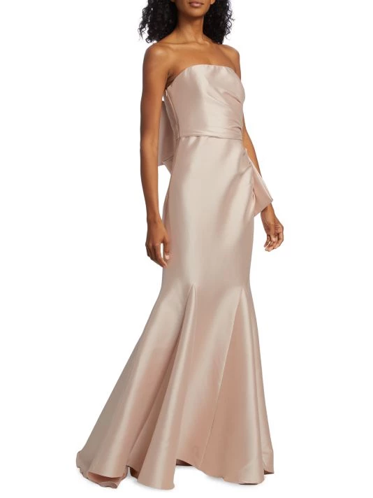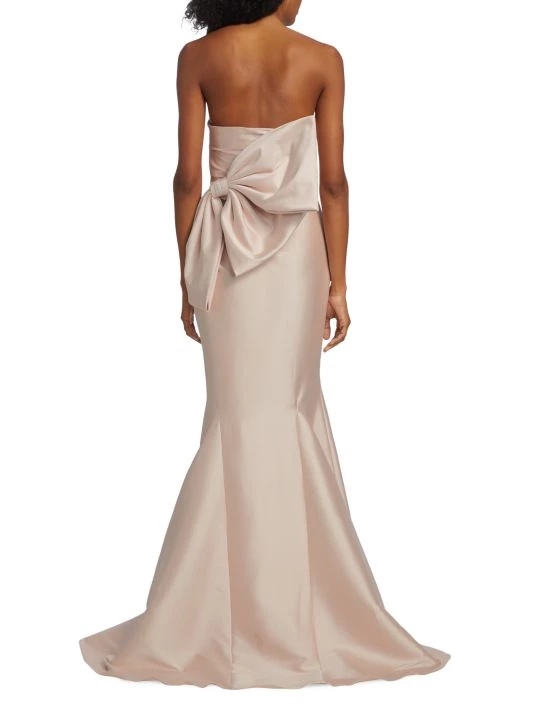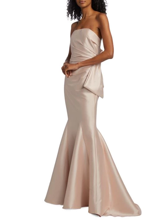 Crafted of luxurious mikado fabric, this Badgley Mischka mermaid gown features a fitted, draped bodice with an oversized bow detail at the back. A godet skirt completes this glamorous look.