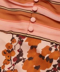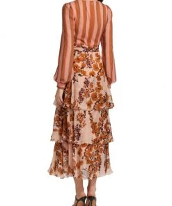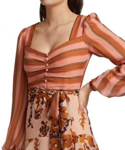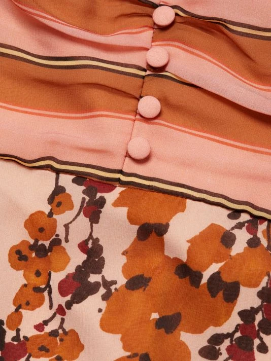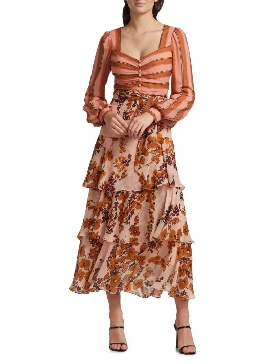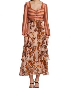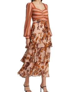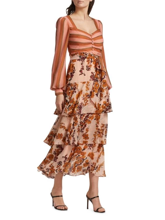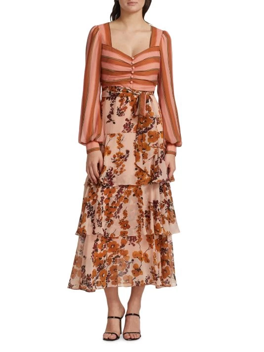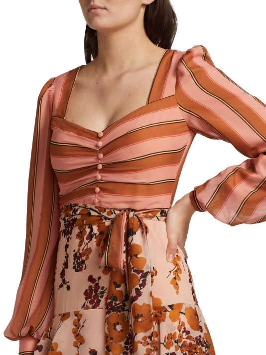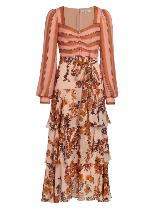 This midi-dress from Badgley Mischka is adorned with mixed stripes and floral prints with a ruffled skirt and a self-tie belt.