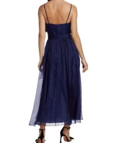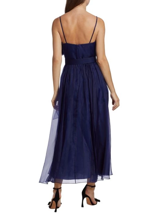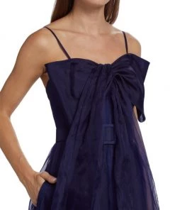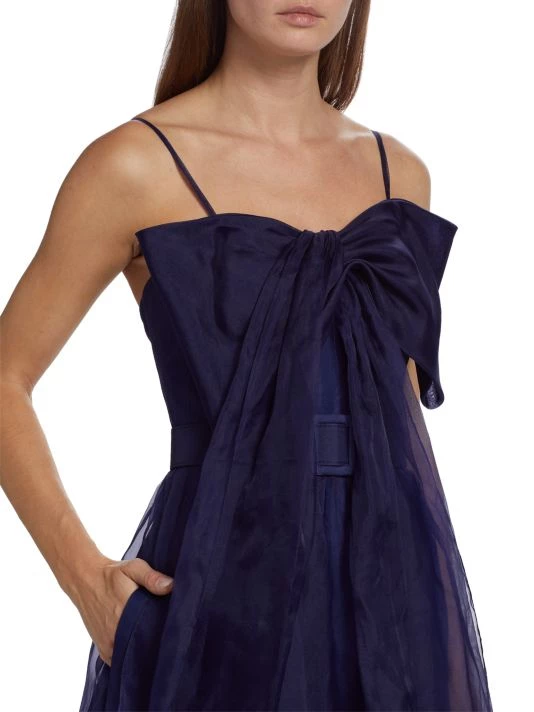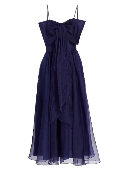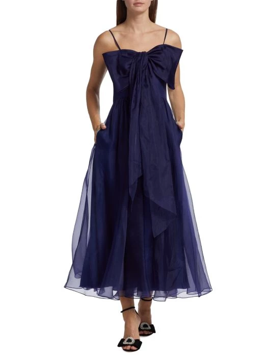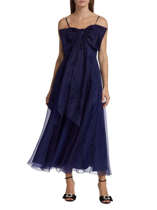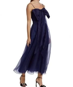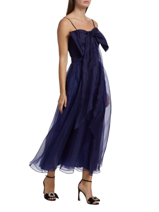 Crafted of fine silk, Badgley Mischka’s tea-length dress features an oversized elegant bow at the bodice.