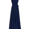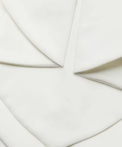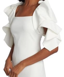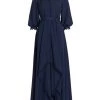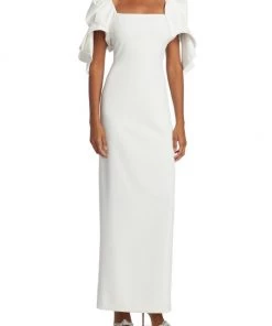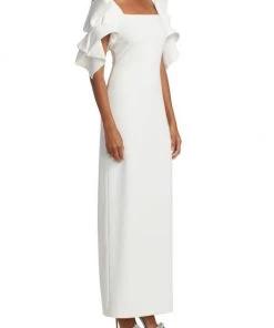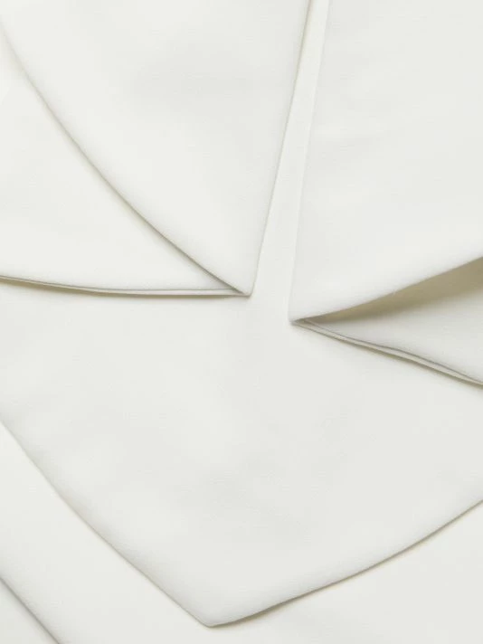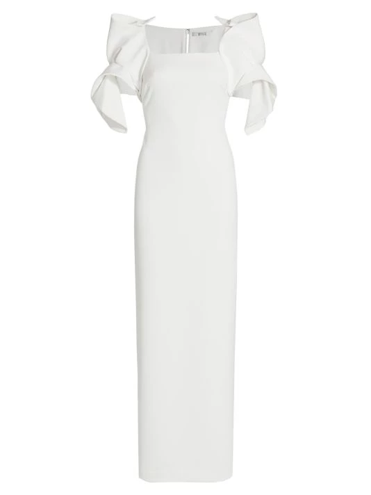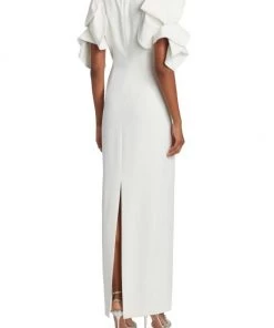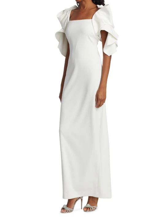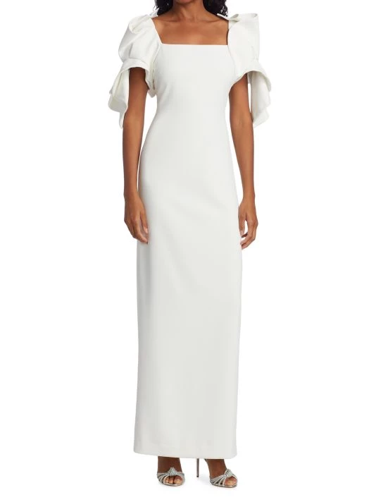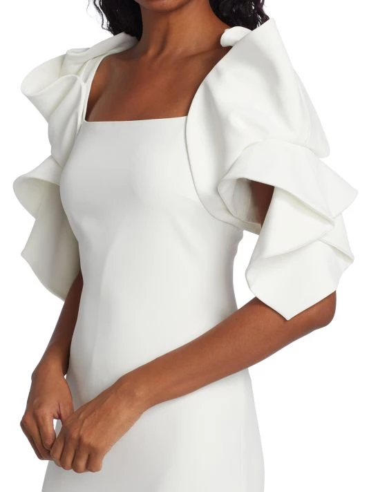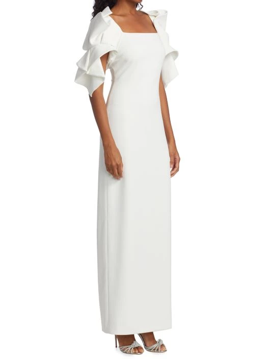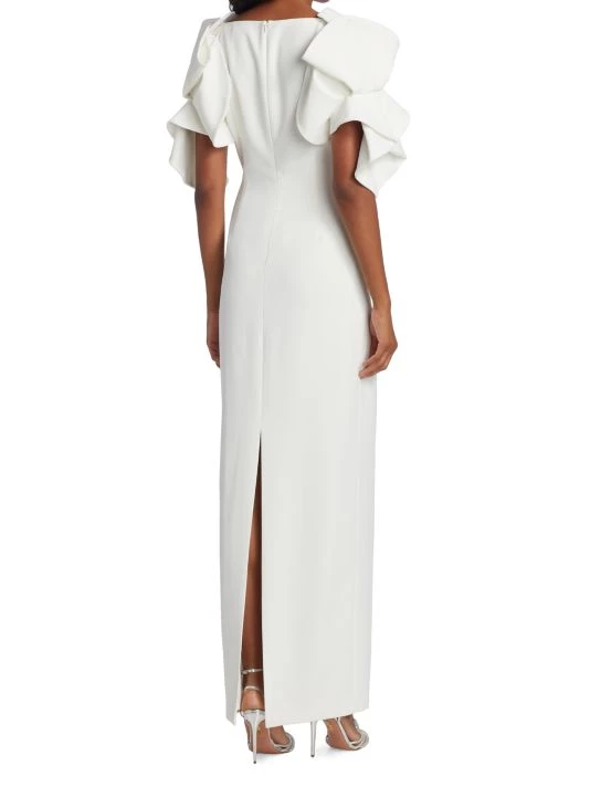 A-line crepe gown with large, asymmetric origami-inspired sleeves.