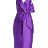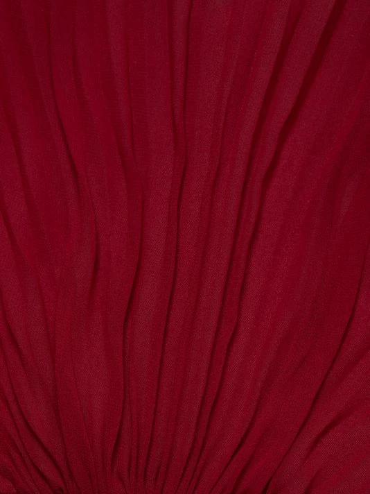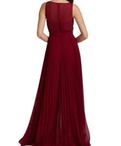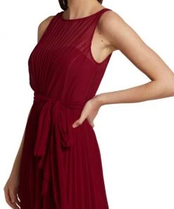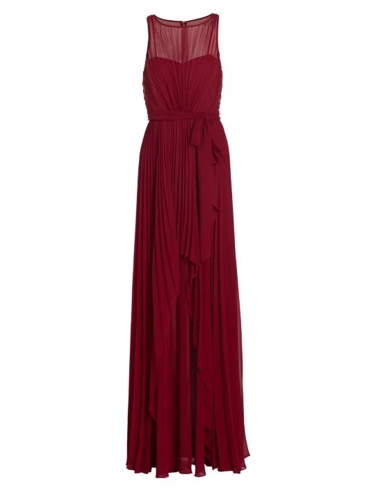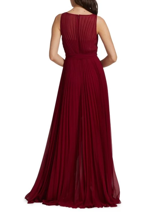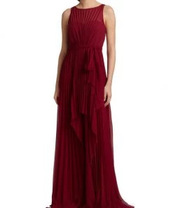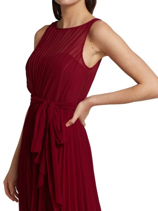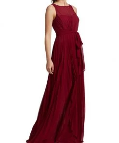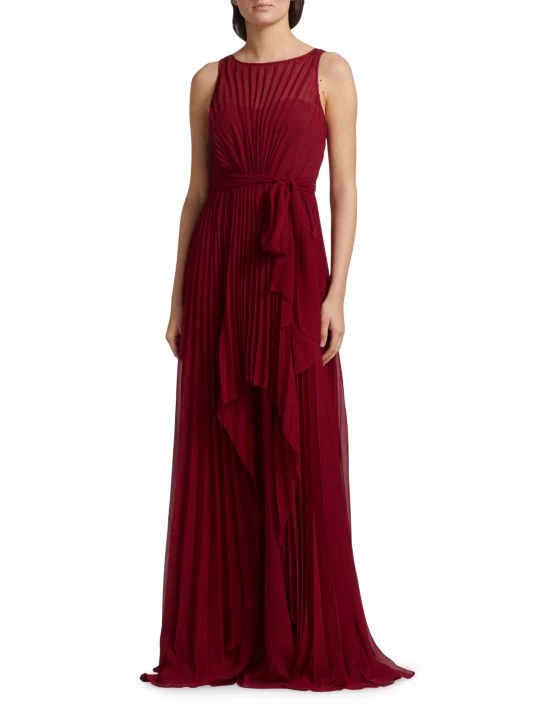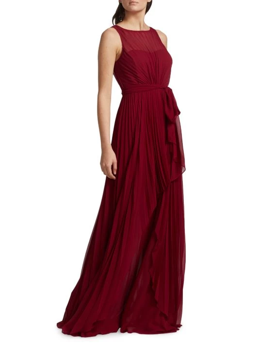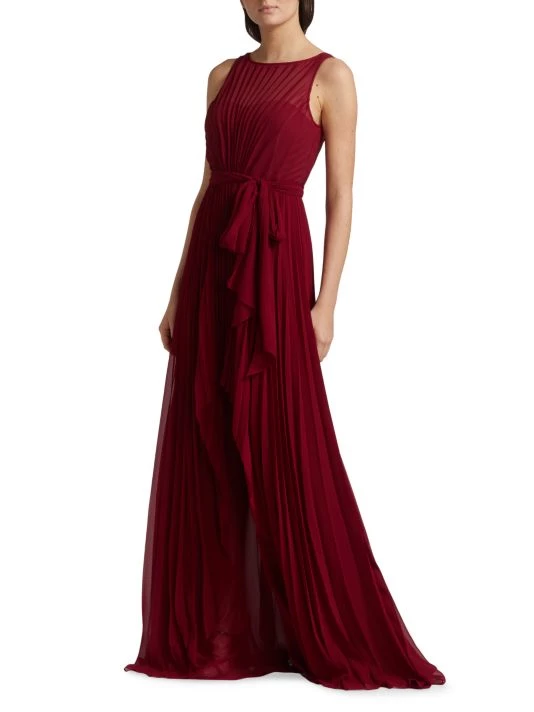 This pleated gown from Badgley Mischka is crafted of lightweight chiffon with a self-tie accent at the waist and a high-low hem.