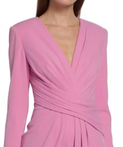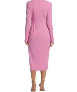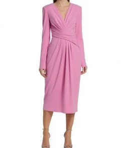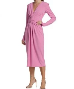 Badgley Mischka’s midi-dress features a flattering v-neckline with a pleated waist.