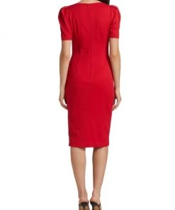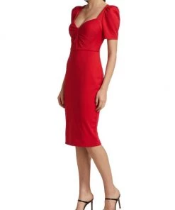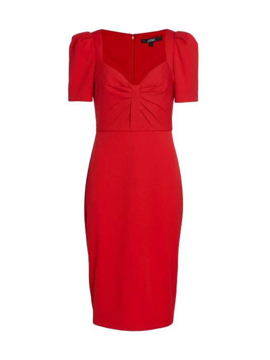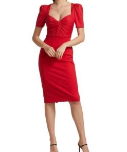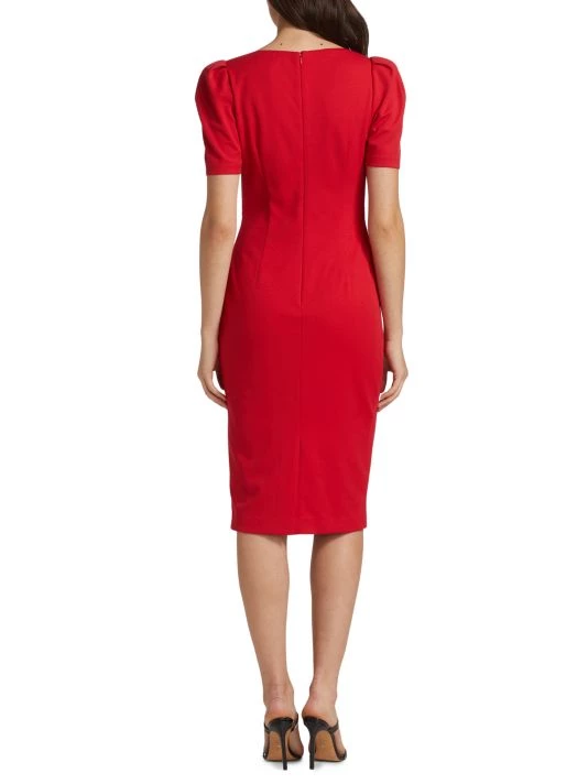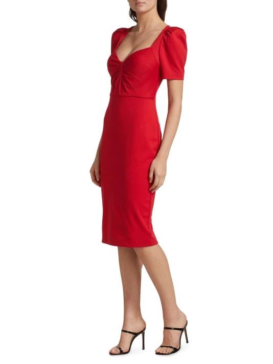 This cocktail dress from Badgley Mischka is designed with a flirty sweetheart neck and dramatic puff sleeves.