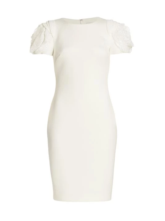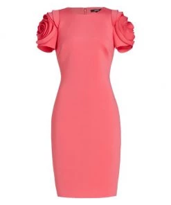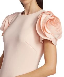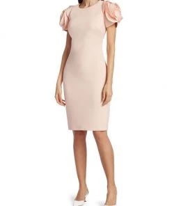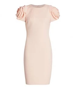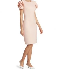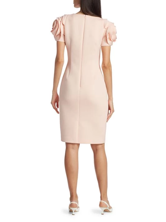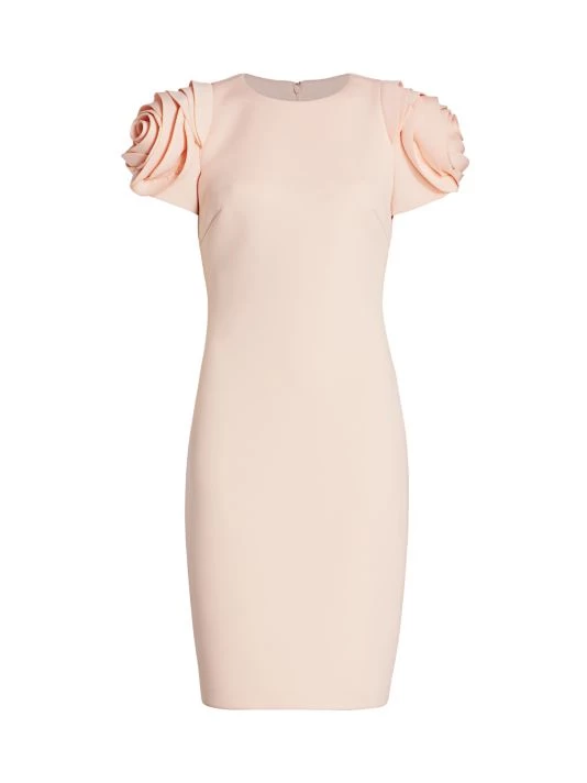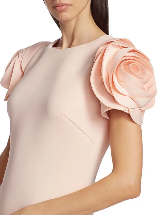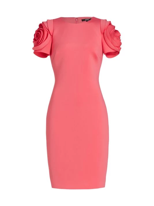 Alluring cocktail dress with rosette sleeves and a scuba fabrication.