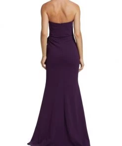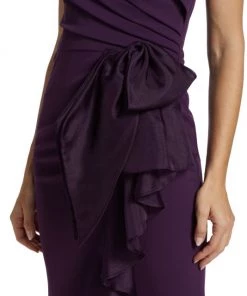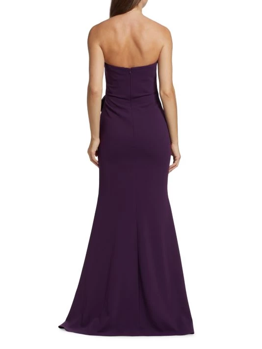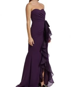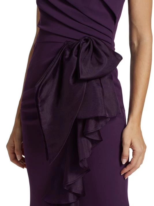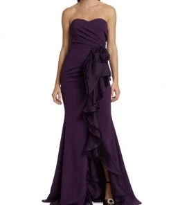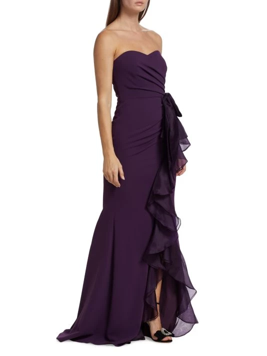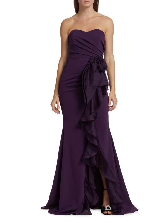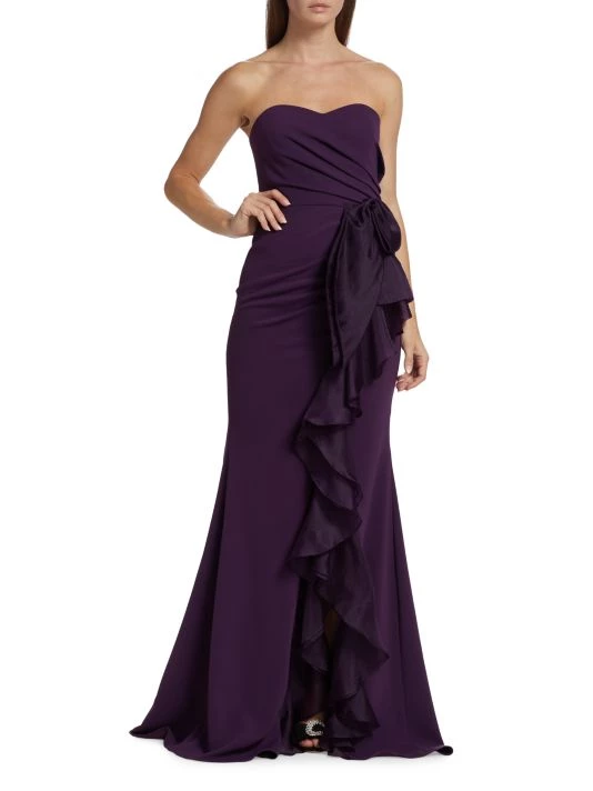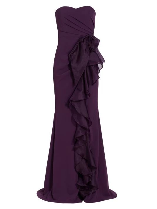 Cut in a mermaid silhouette, Badgley Mischka’s floor-length gown flaunts a romantic ruffle detail and front slit.