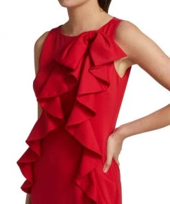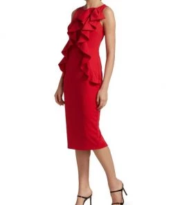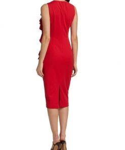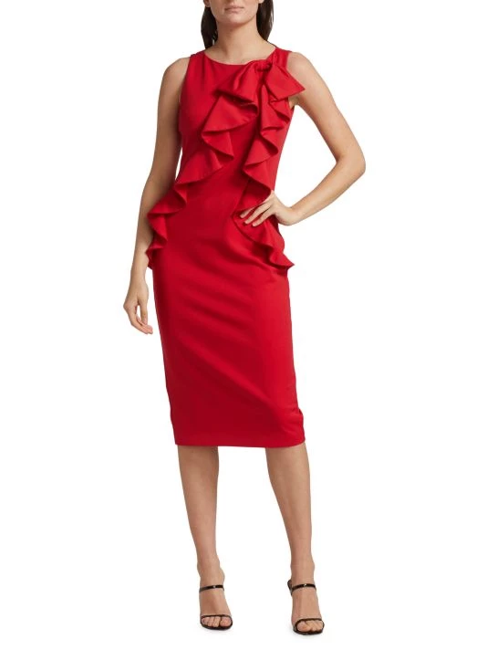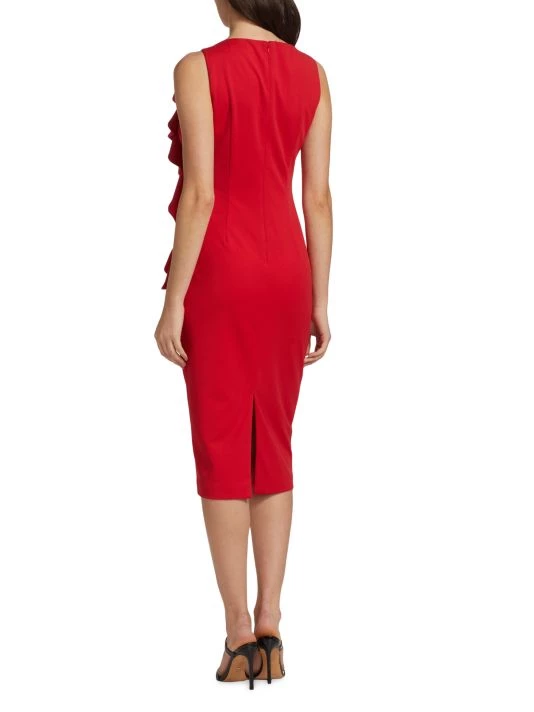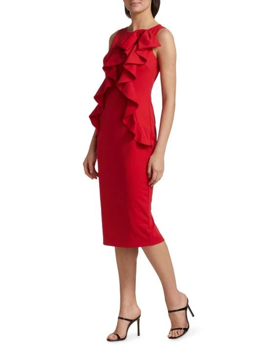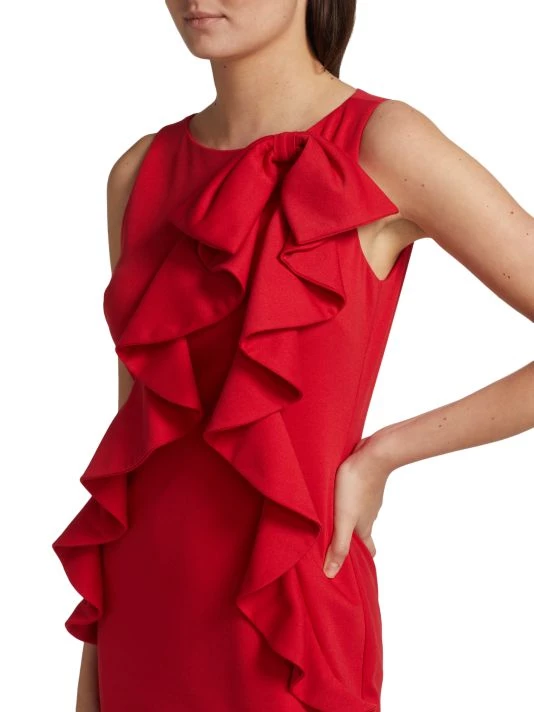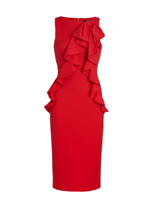 This cocktail dress from Badgley Mischka is cut in a slimming sheath silhouette with a ruffled accent at the bodice.