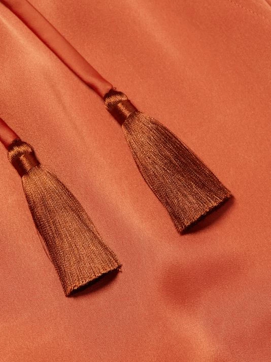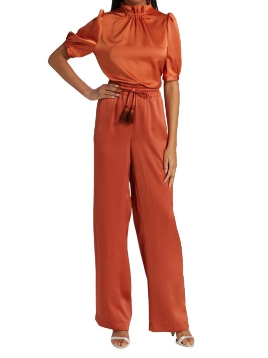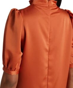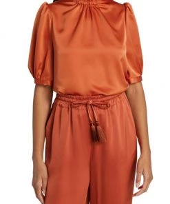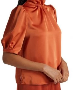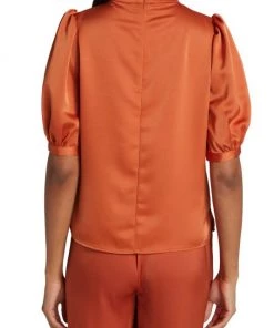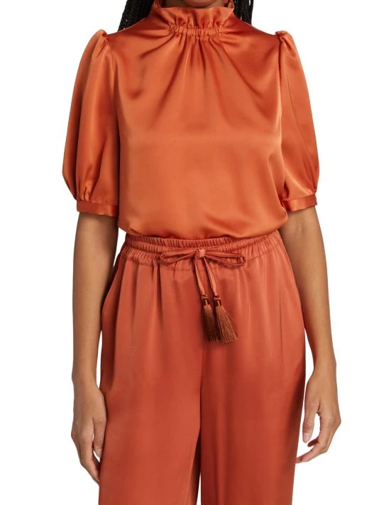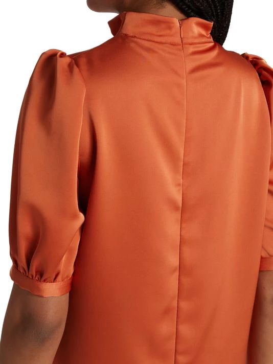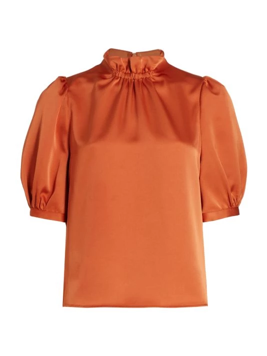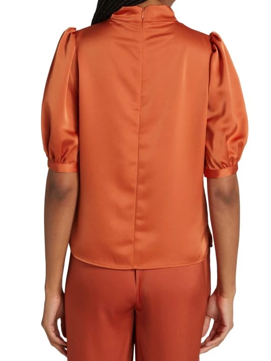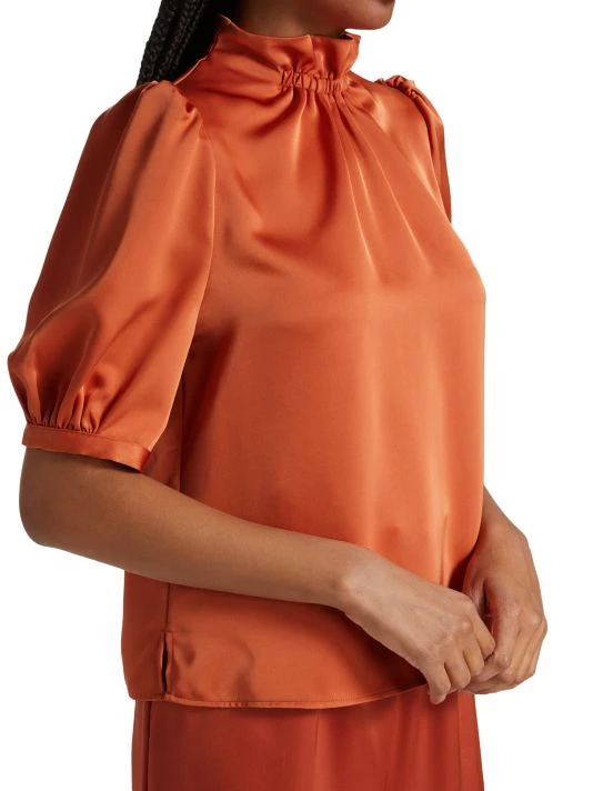 Badgley Mischka’s sleek top is styled with a ruched mockneck and short sleeves.