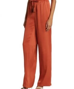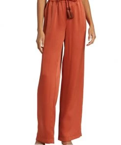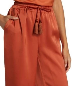Badgley Mischka’s sleek satin palazzo pants are styled with tassels at the drawstring waist.