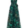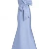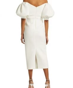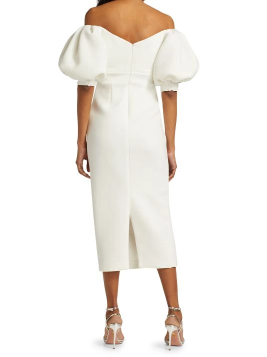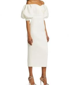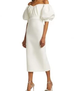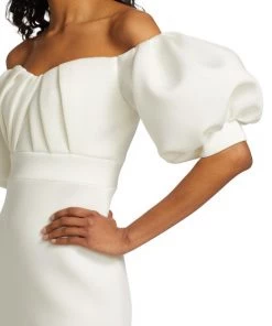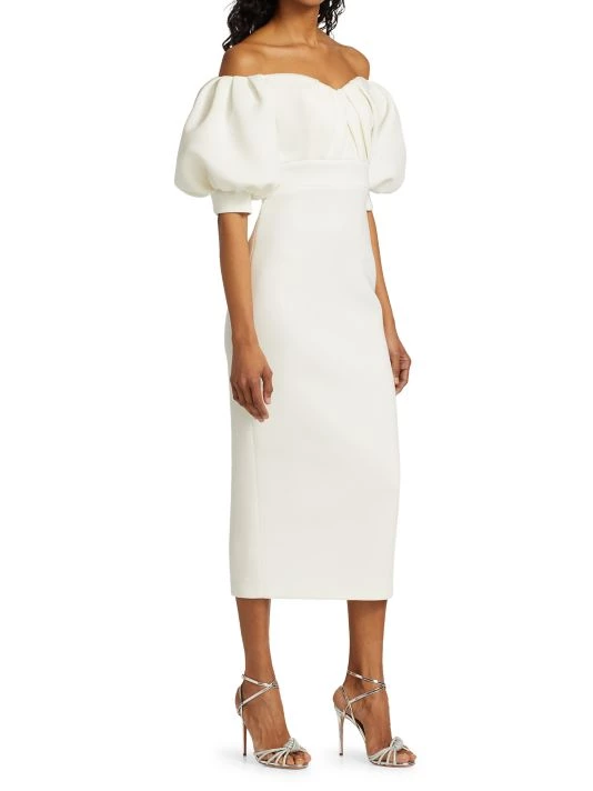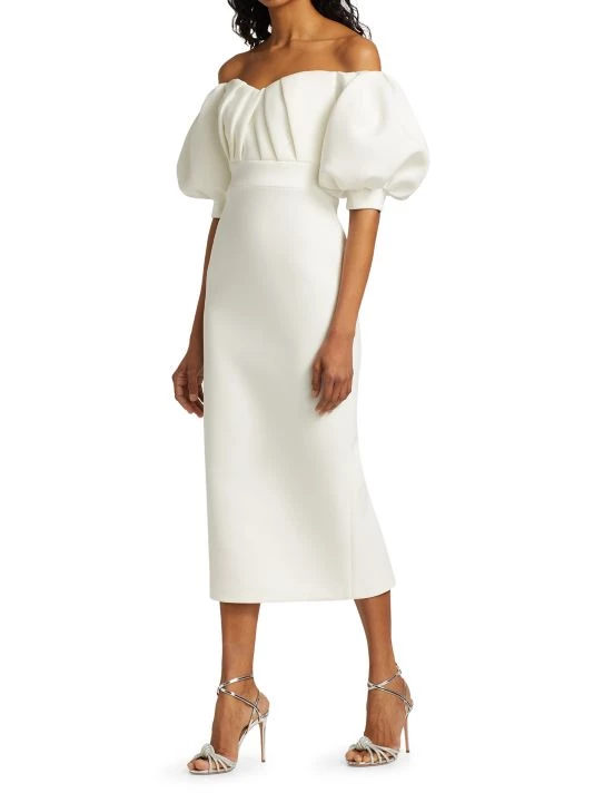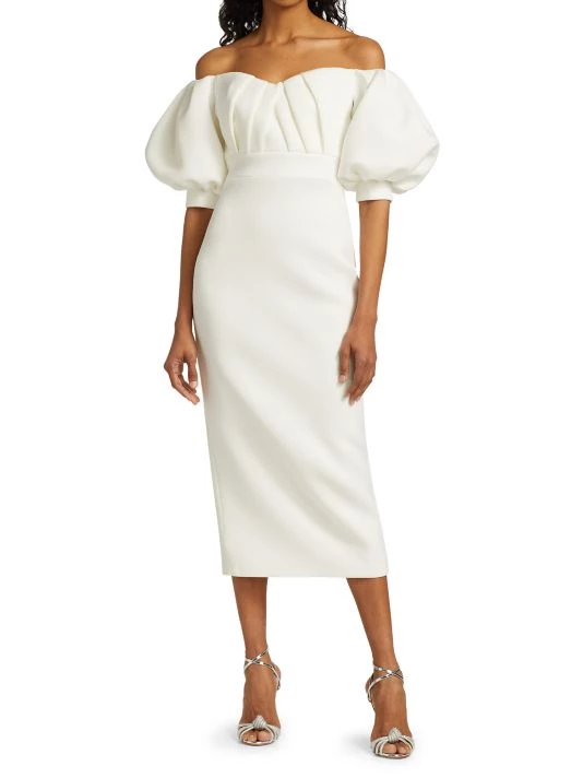 This sophisticated midi-dress by Badgley Mischka showcases a pleated off-the-shoulder bodice framed by dramatic puff sleeves, transitioned into a clean column-style silhouette.