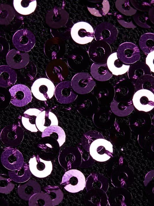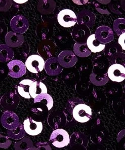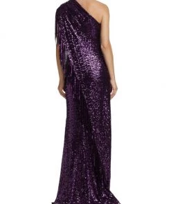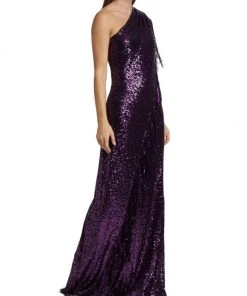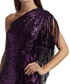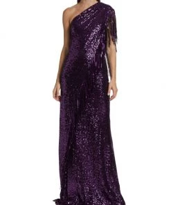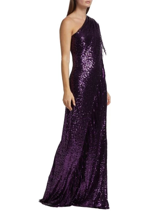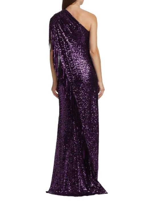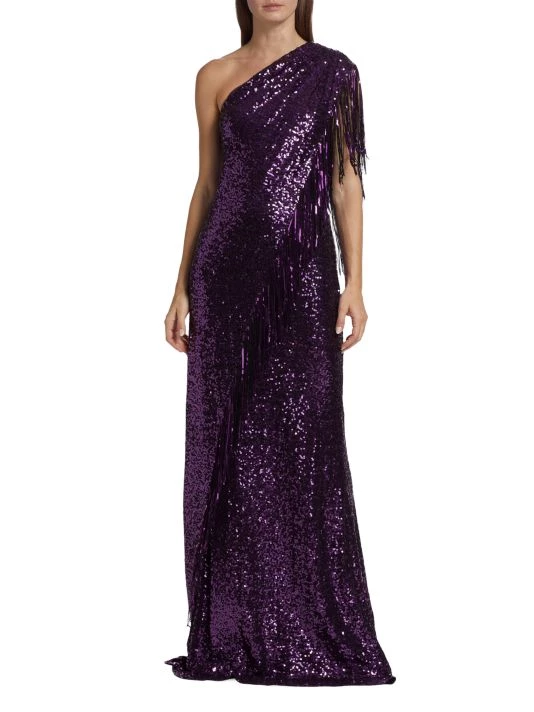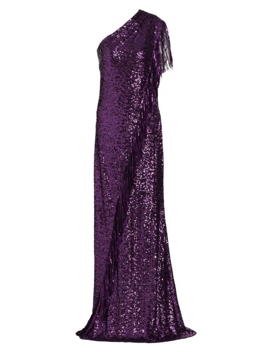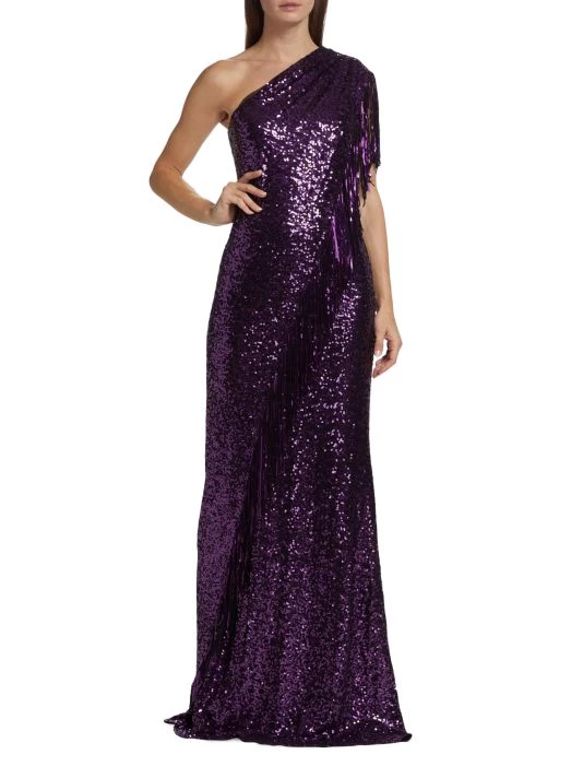 Badgley Mischka’s floor-length gown flaunts sparkling sequins and is accented with fringe detail.
