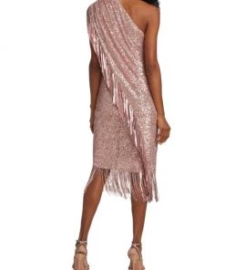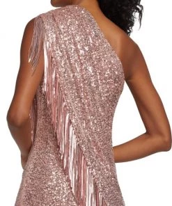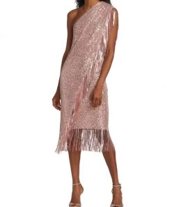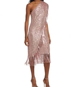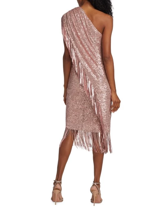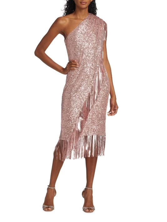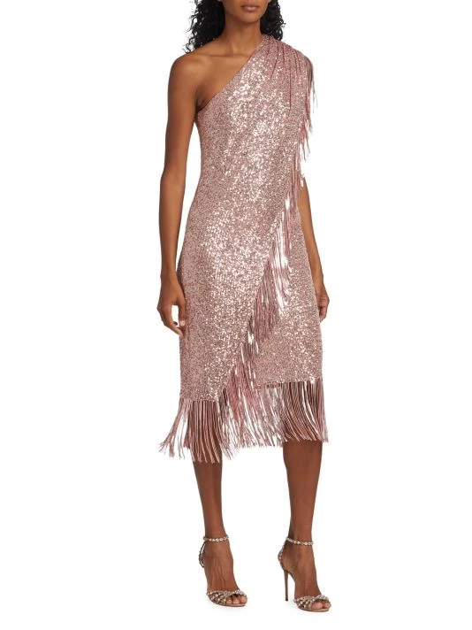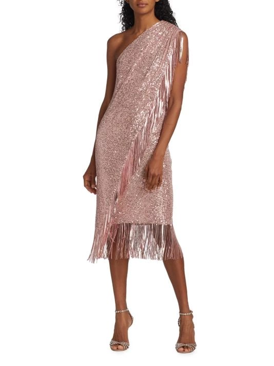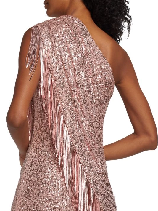 ONLY AT SAKS. Rendered in sparkling sequins, Badgley Mischka’s one-shoulder dress is designed with wispy fringes that drape across the body.