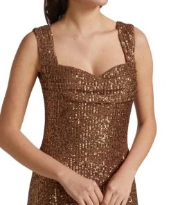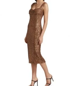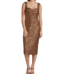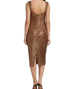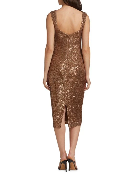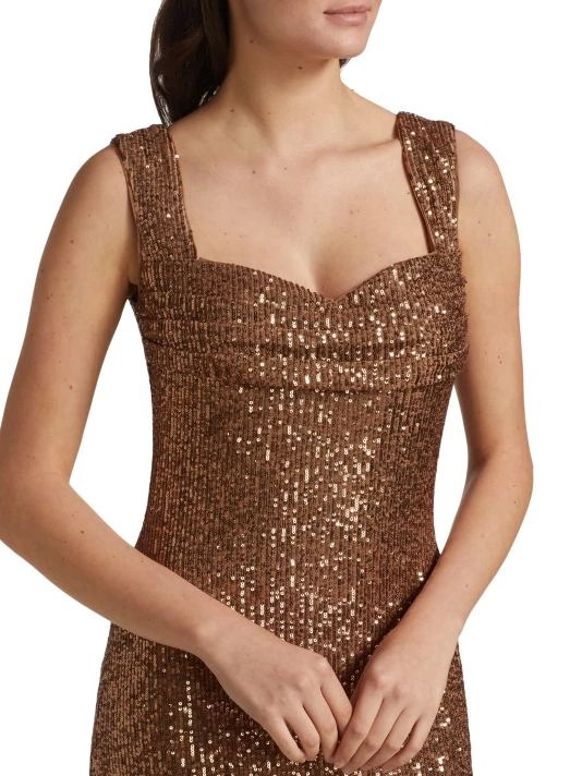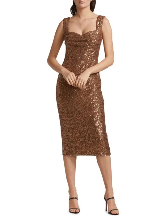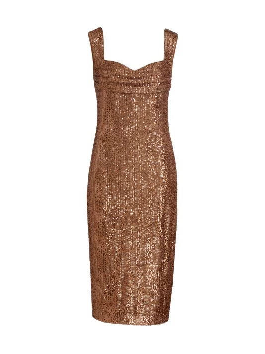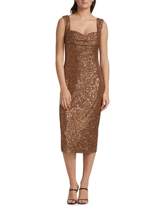 This knee-length dress from Badgley Mischka is crafted of glitzy sequins with a flirty sweetheart neck.