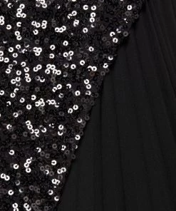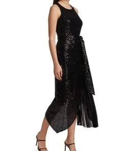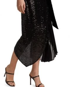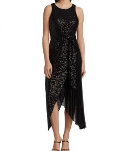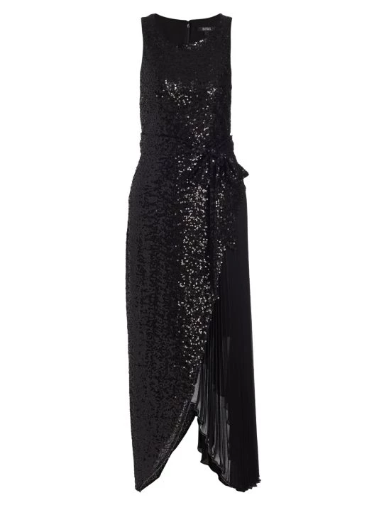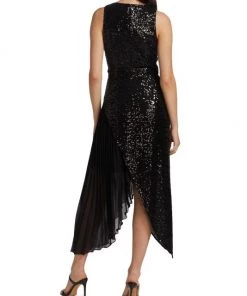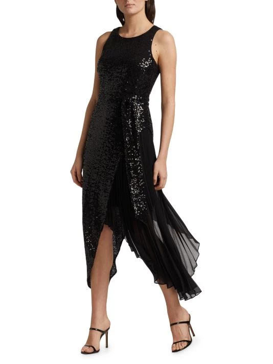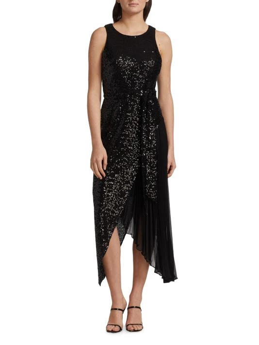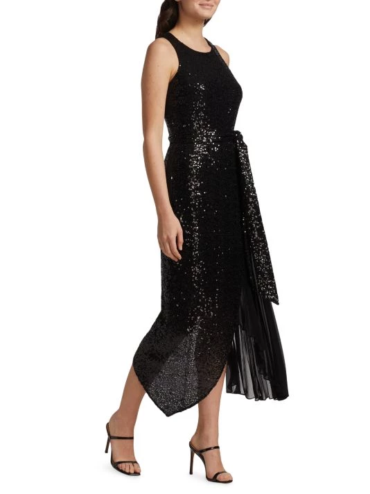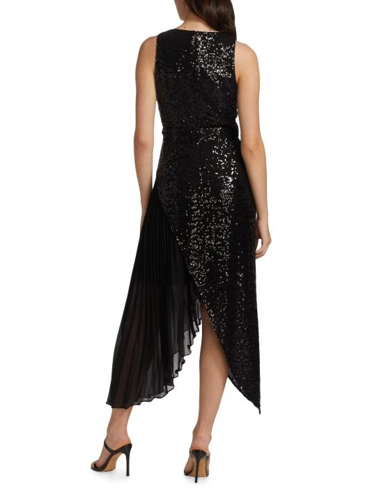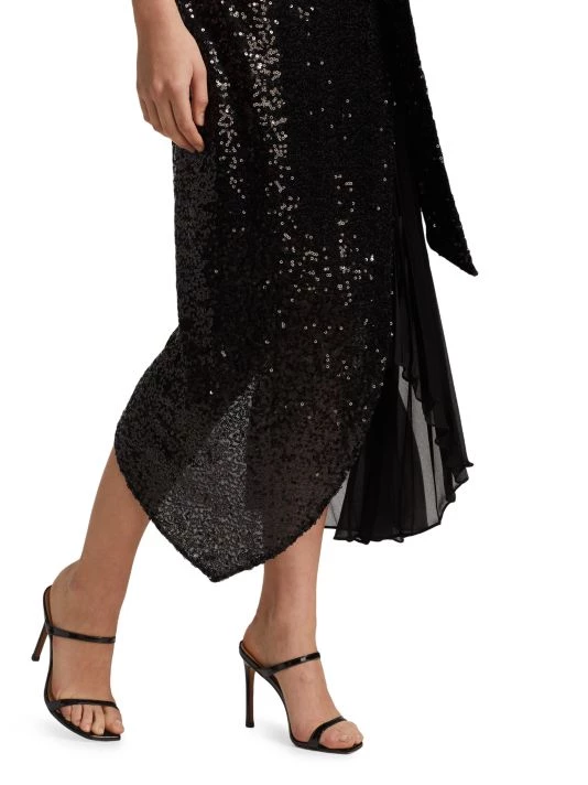 This unique midi-dress from Badgley Mischka is crafted of glitzy sequins with a pleated skirt detail.