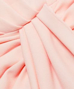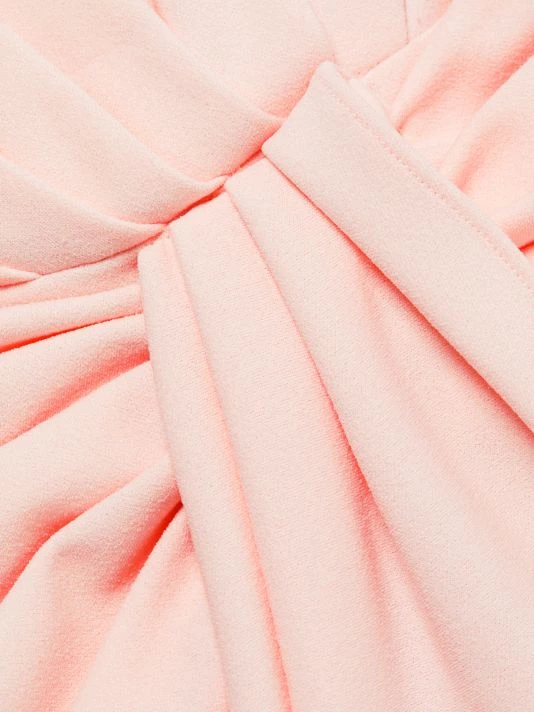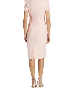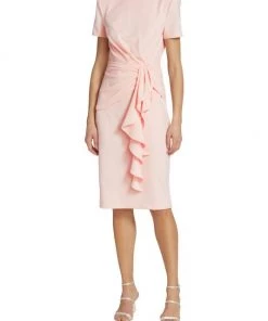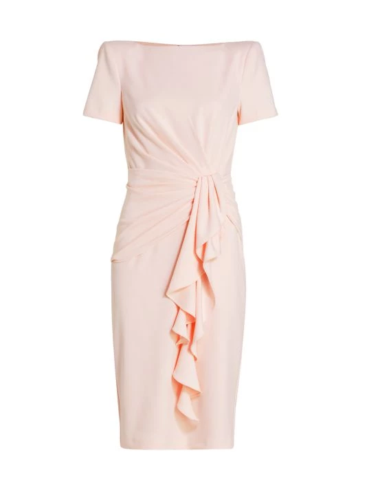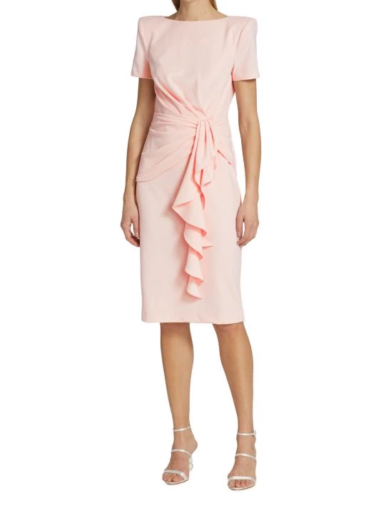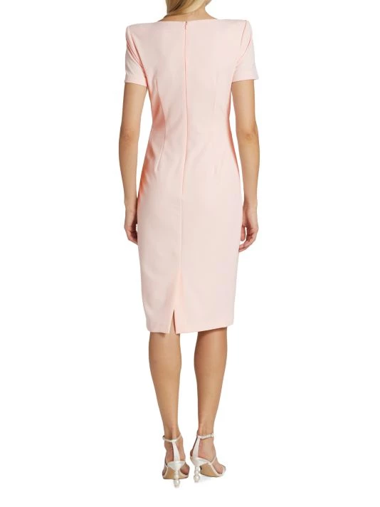 This sheath dress is designed with padded shoulders, featuring draped fabric at the front.