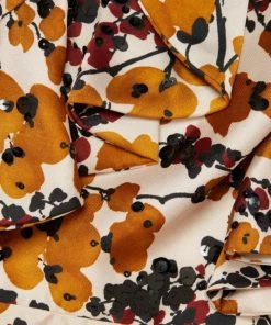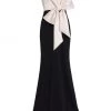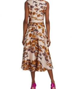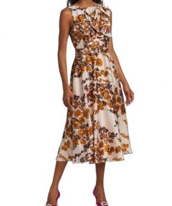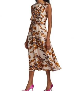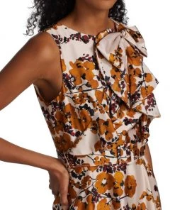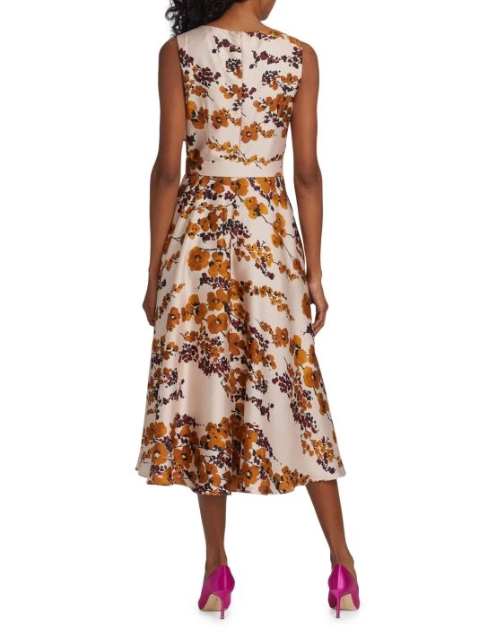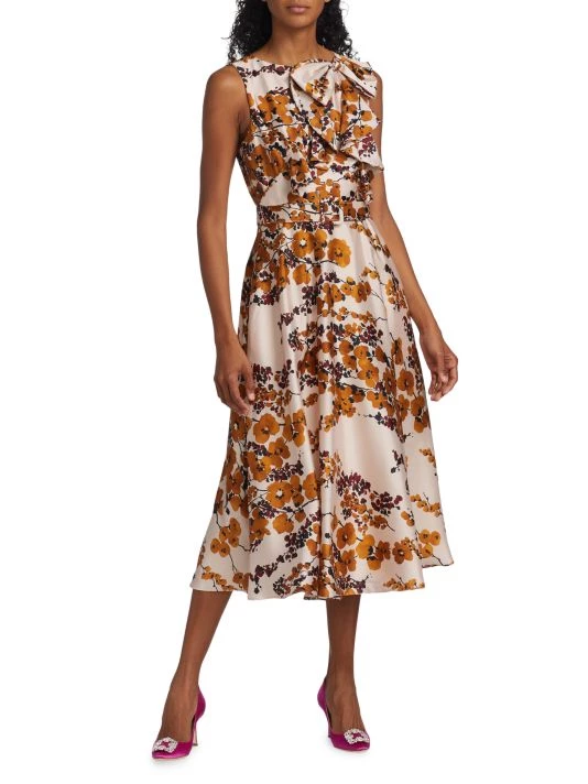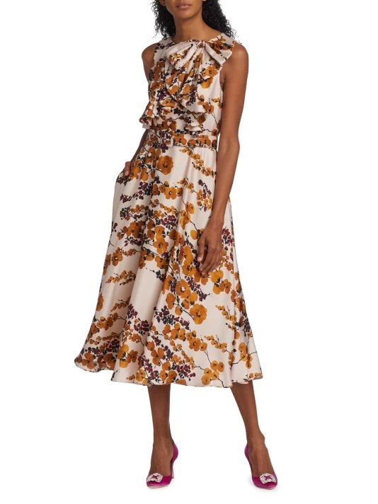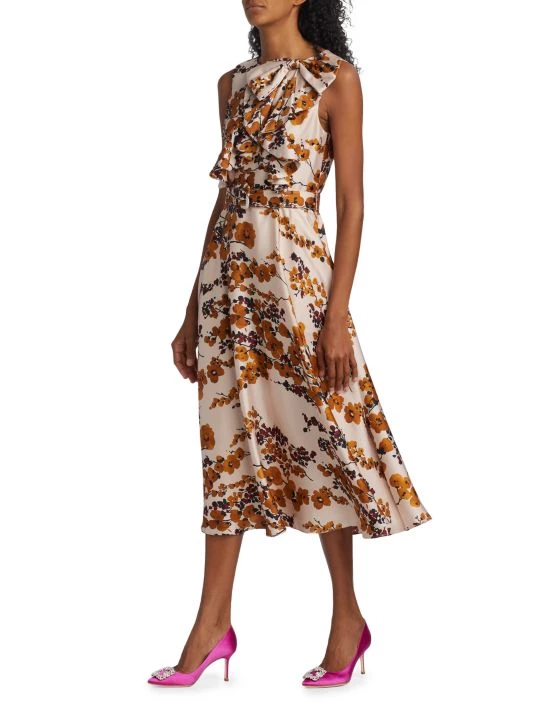 Crafted of floral satin, Badgley Mischka’s sleeveless belted midi-dress features a bow-embellished neckline and ruffled bodice.