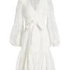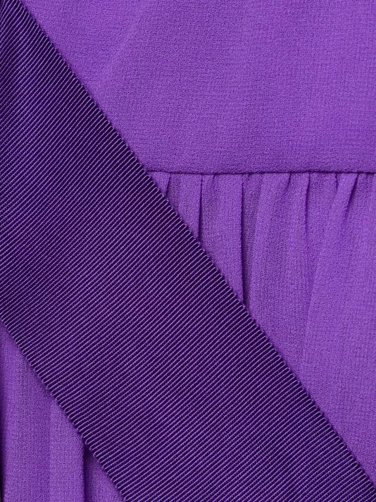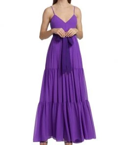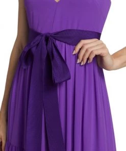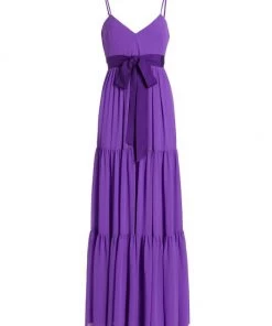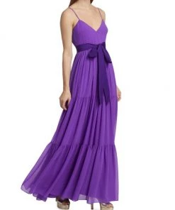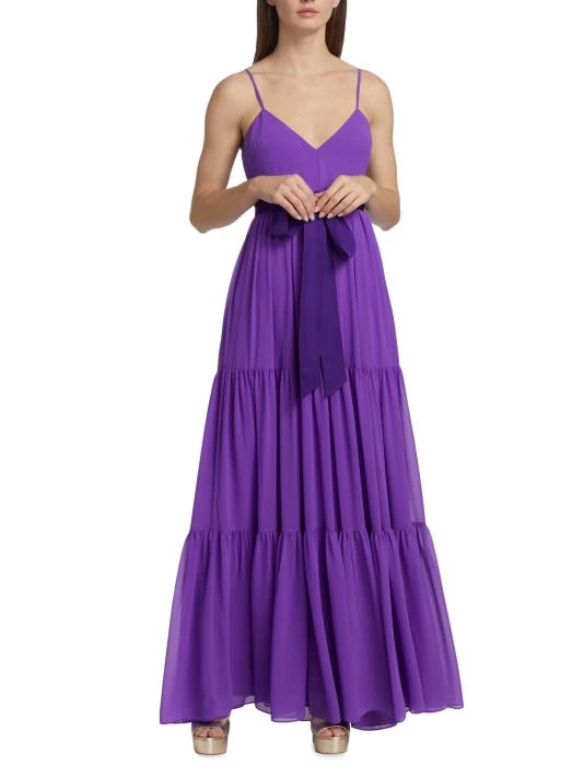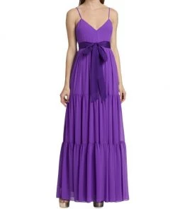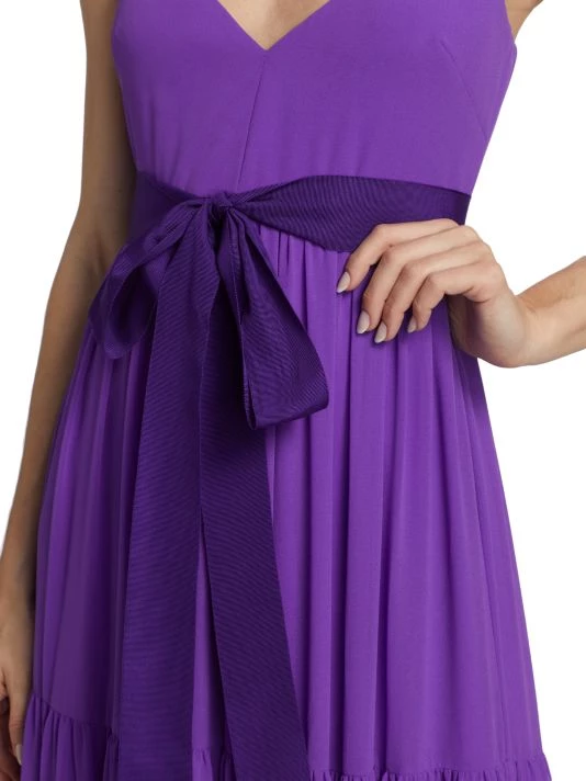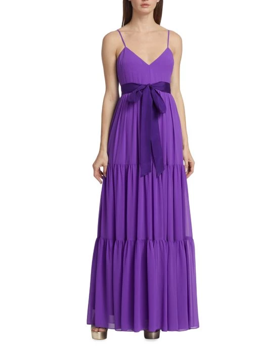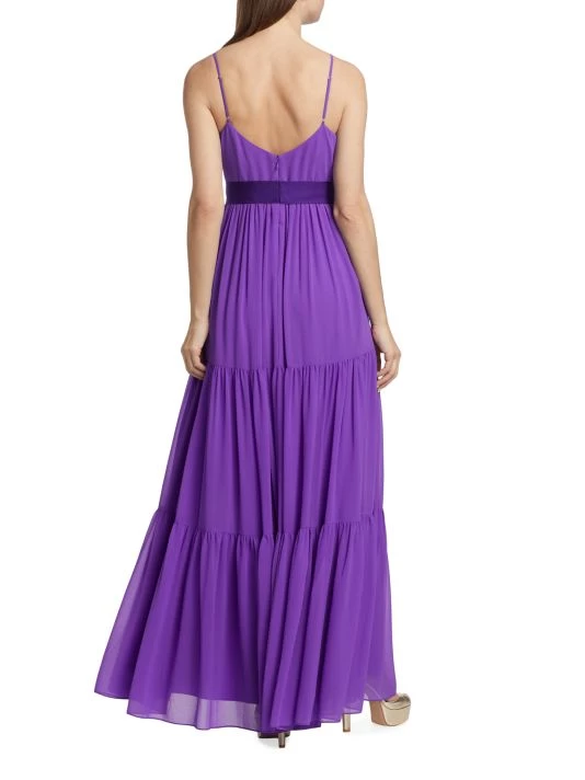 Designed with a long tiered skirt, this sleeveless Badgley Mischka gown is finished with a sash tie at the waist.