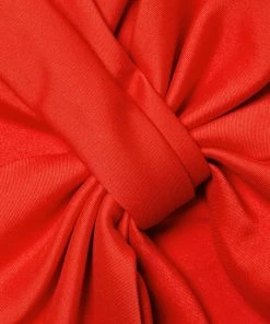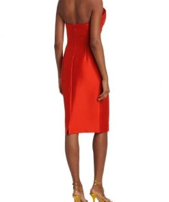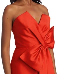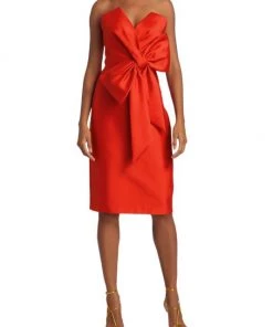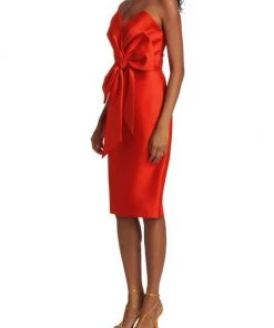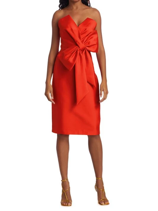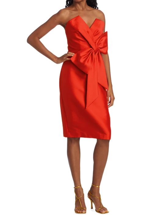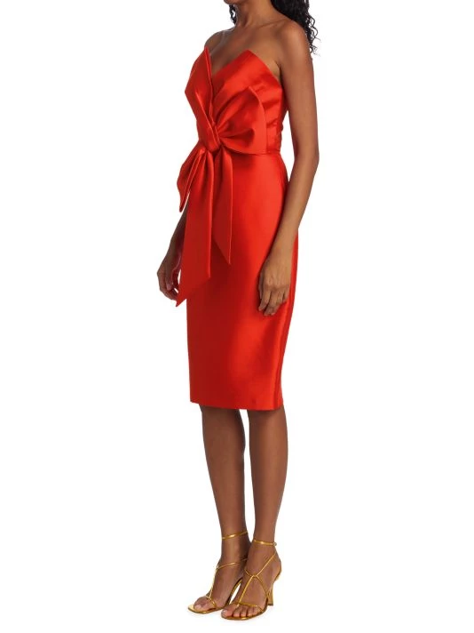 This satin knee-length cocktail dress features a statement bow detail at the center front.