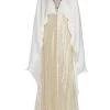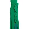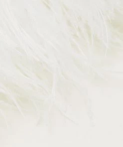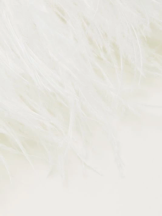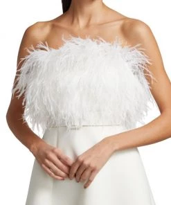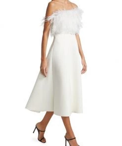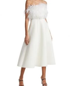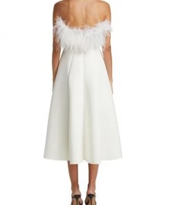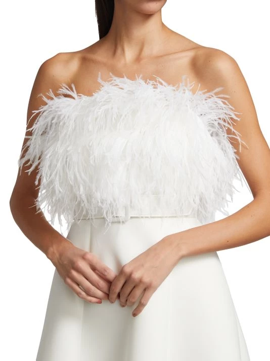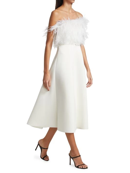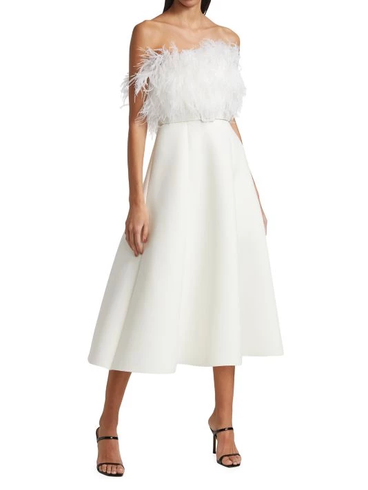 Classic fit-and-flare dress cut in a midi-length, enhanced with billowy feathers at the strapless bust.