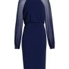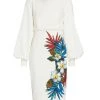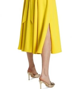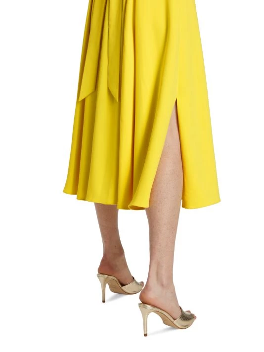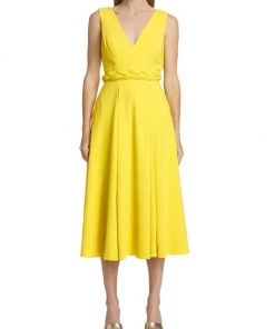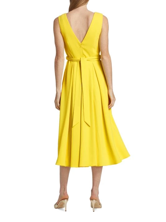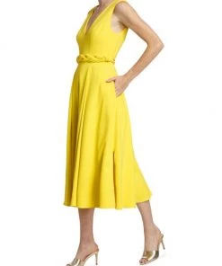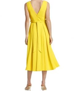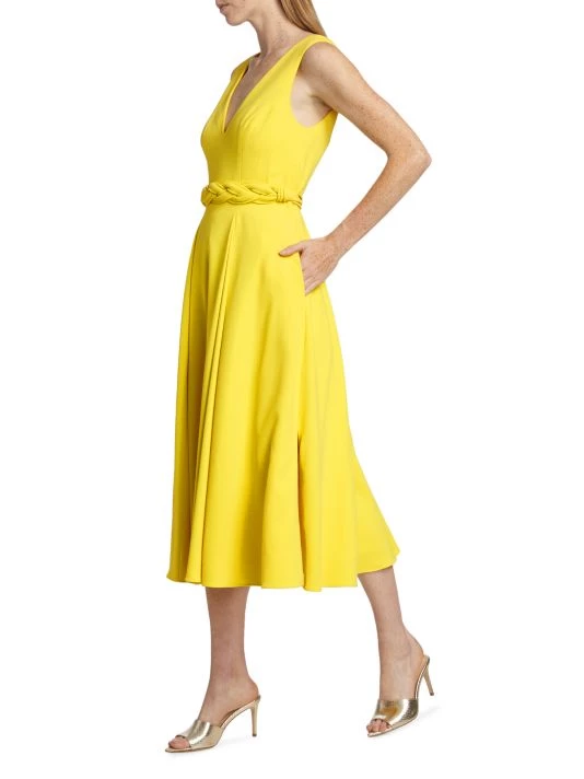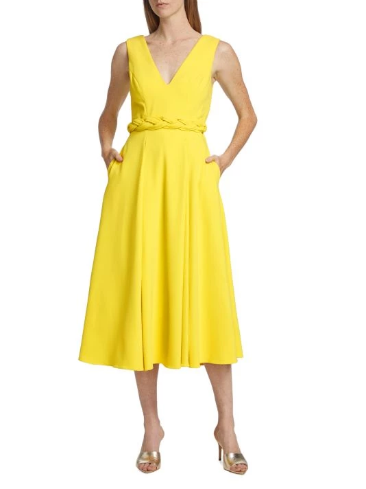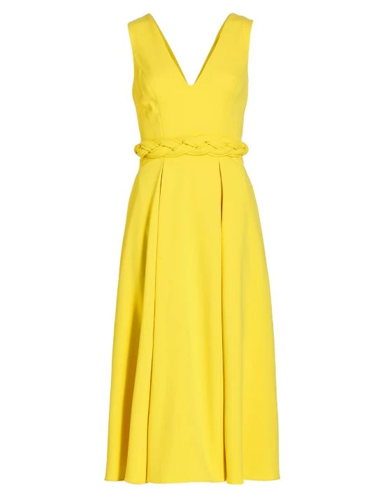 This A-line dress from Badgley Mischka features a V-neck and V’d back. A matching braided belt and side on-seam pockets complete this sunny style.