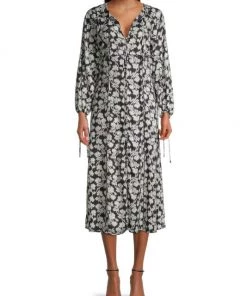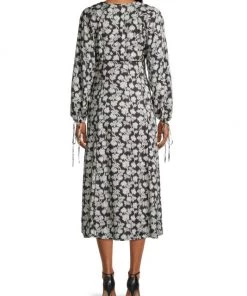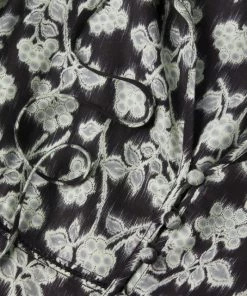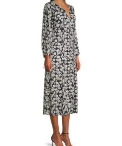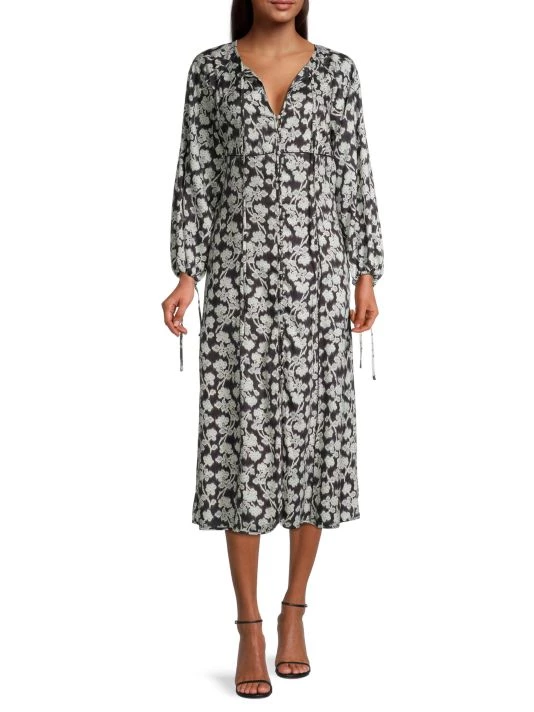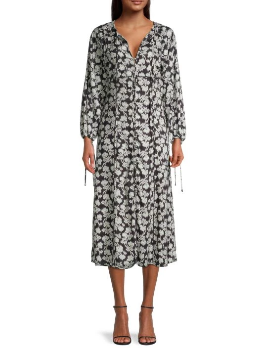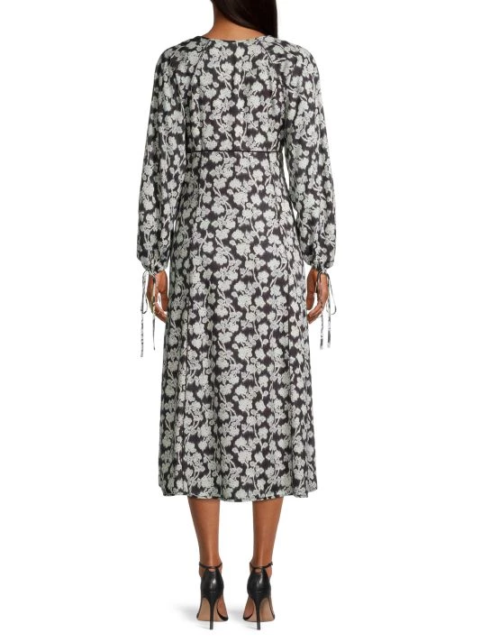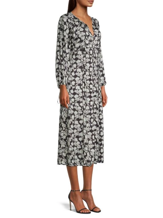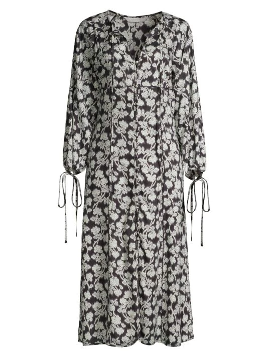 Lightweight midi-dress with two-tone floral print and visible cross-stitching for added dimension.