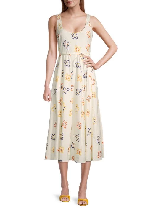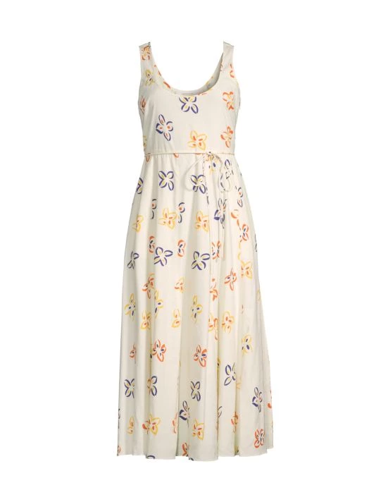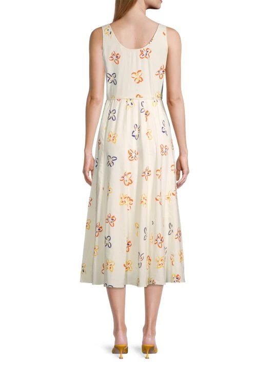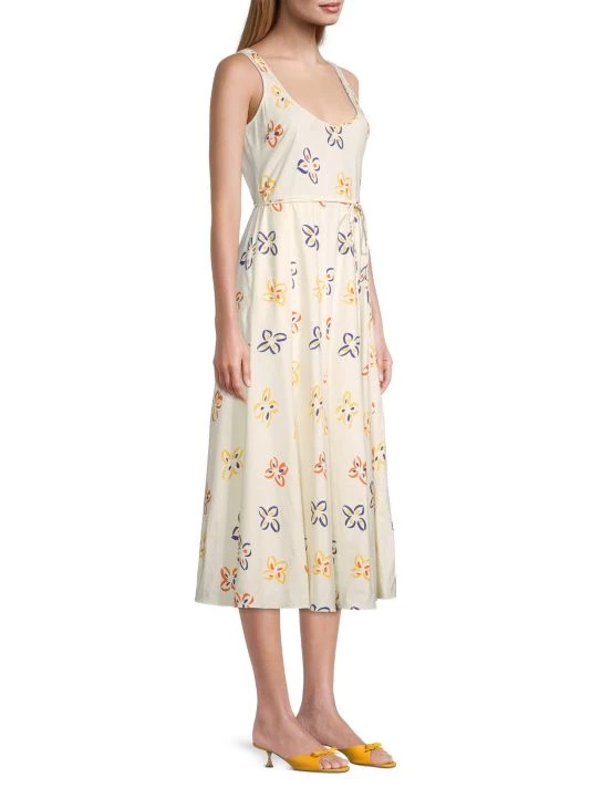 The Flame Fleur dress from designer Rebecca Taylor is crafted of a smooth linen blend in a hand-painted floral print. A classic scoopneck and matching self-tie belt complete this midi-length style.