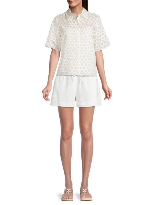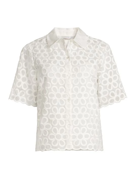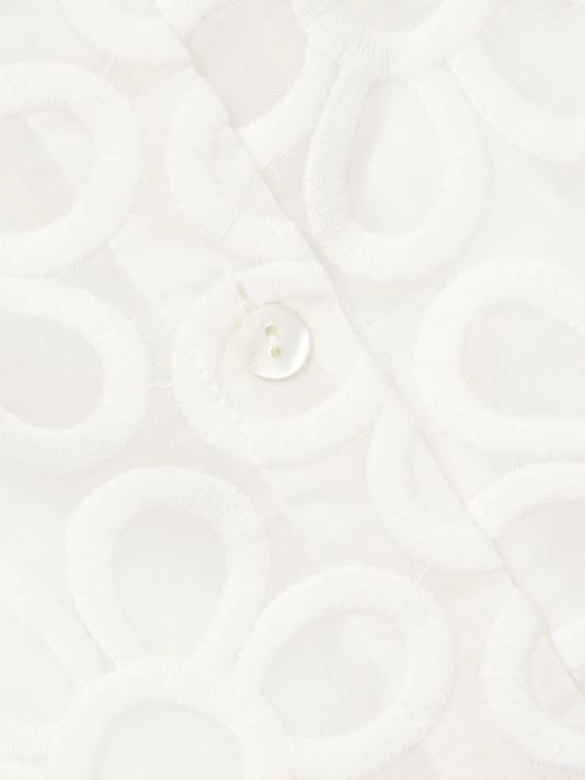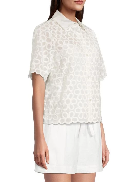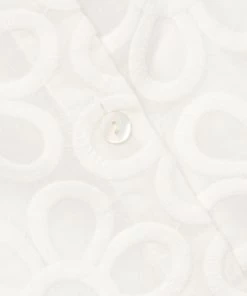 This charming collared shirt is woven with a cotton-silk blend, adorned with a geometric floral design.