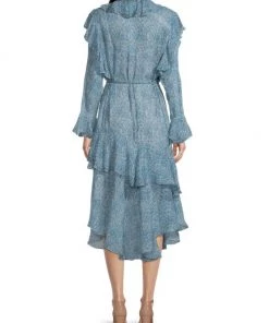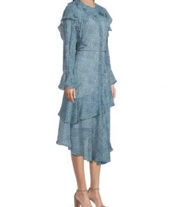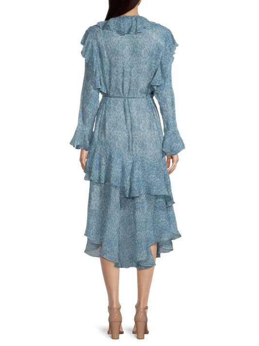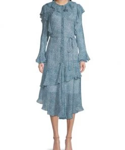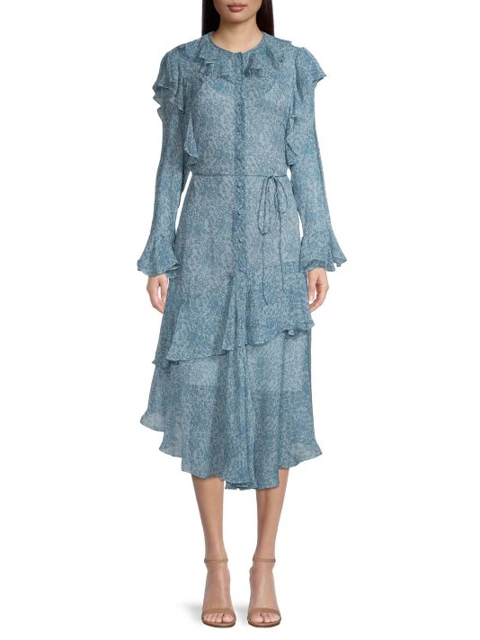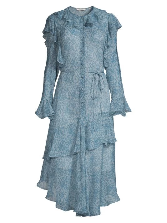 Rebecca Taylor’s charming floral shirtdress flows asymmetrically with ruffles, highlighting the waist with a self-tie.
