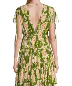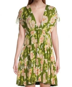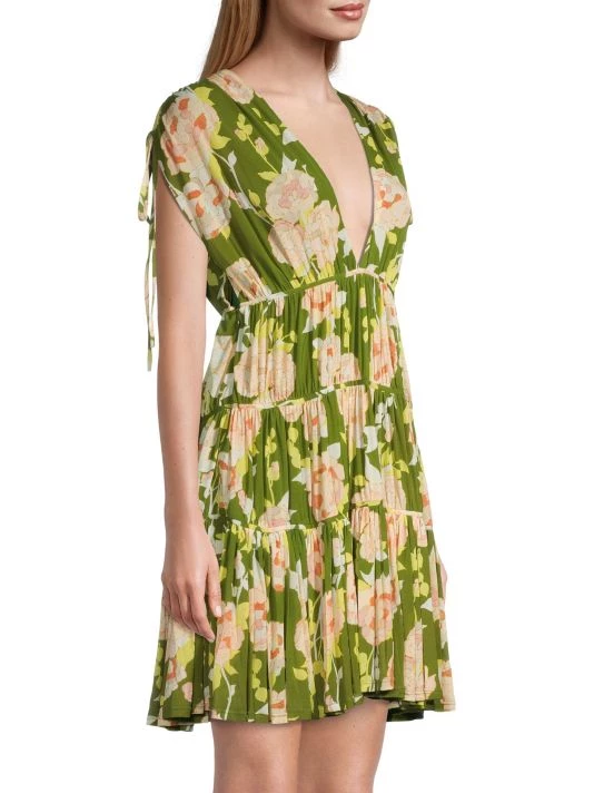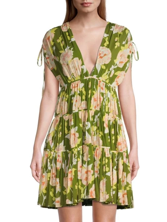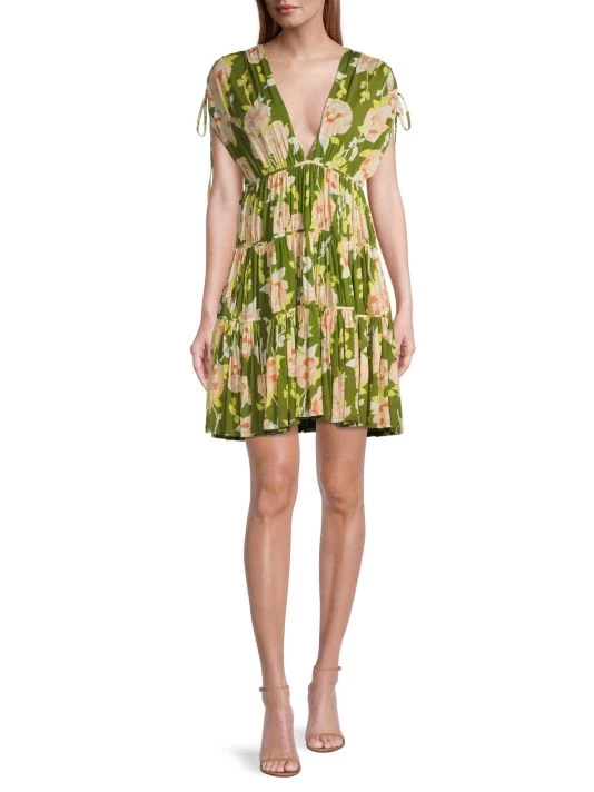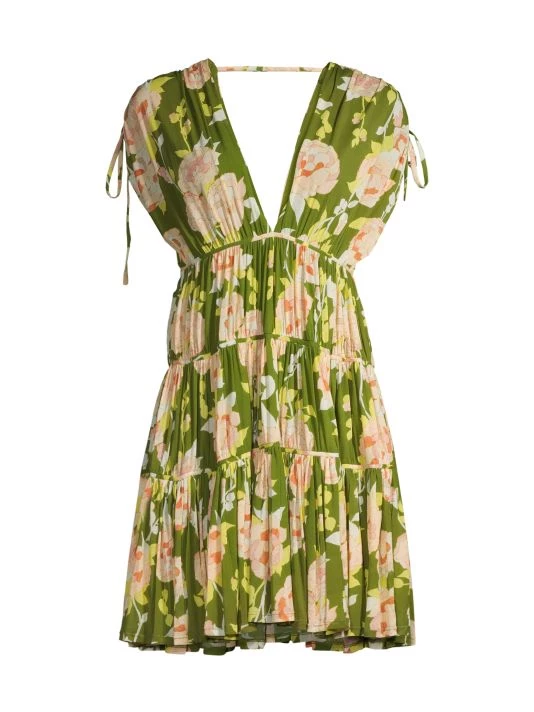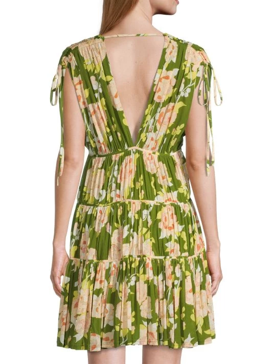 Decorated in an eye-catching floral print, Rebecca Taylor’s minidress flaunt a flattering low-cut V-neckline. This piece is designed with a flowy tiered construction.