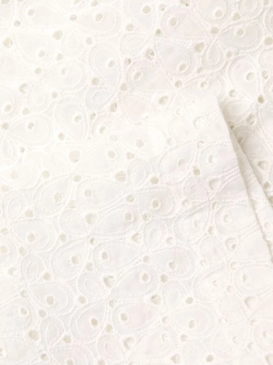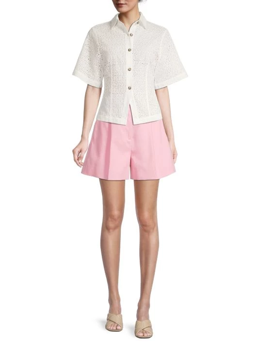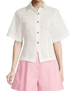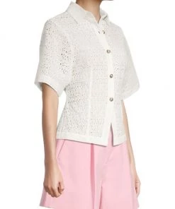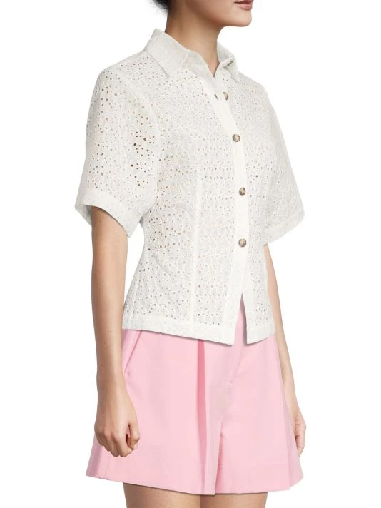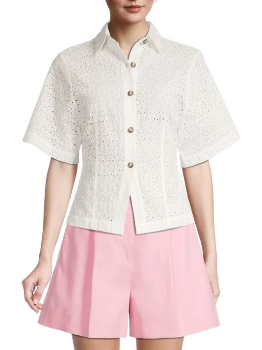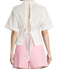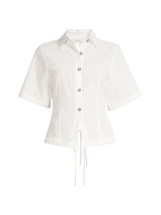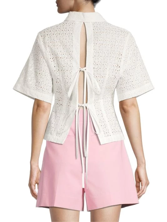 Designed with a V’d hem and dainty back ties, Rebecca Taylor’s Lea blouse is designed with intricate eyelet embroidery.