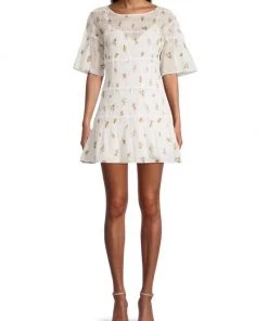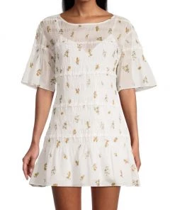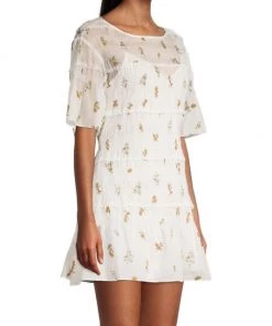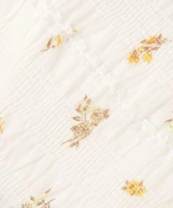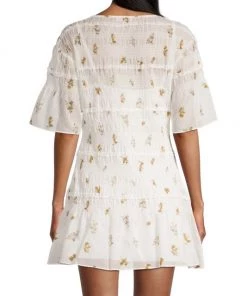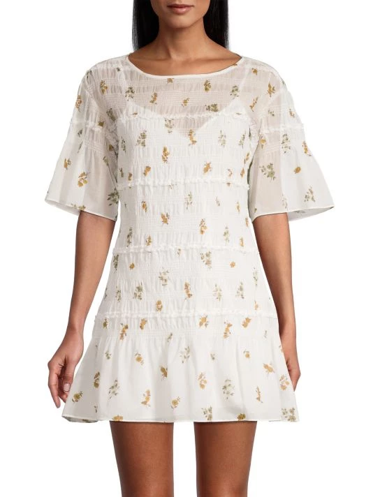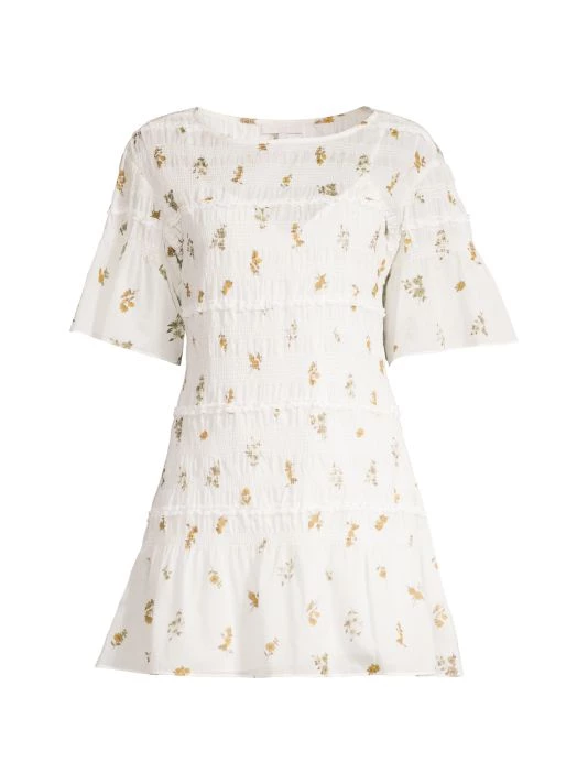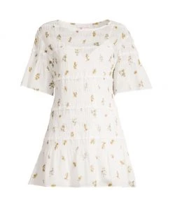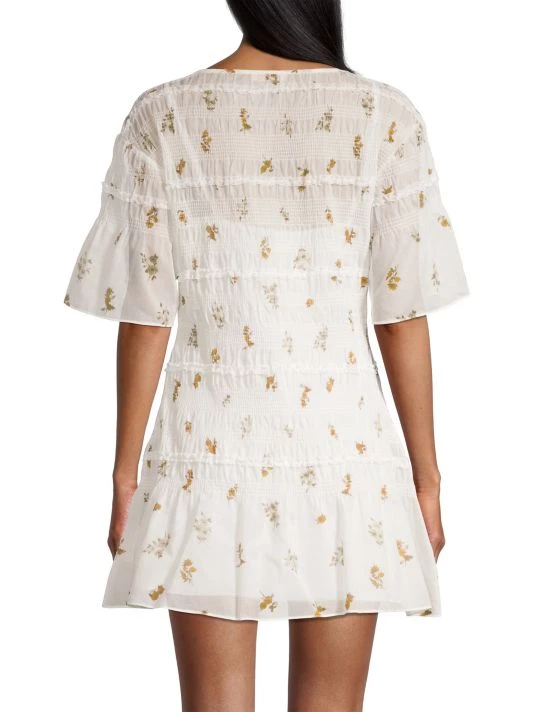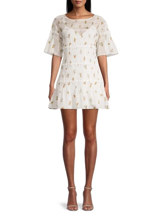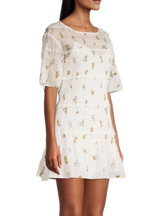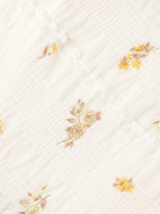 Breezy cotton voile minidress bursts with marigold motif, tiered with lace stripes with subtle smocking throughout.