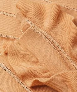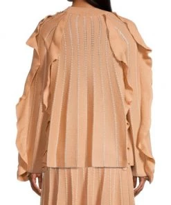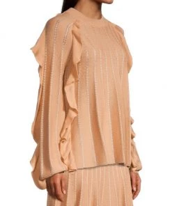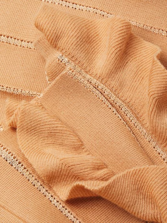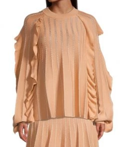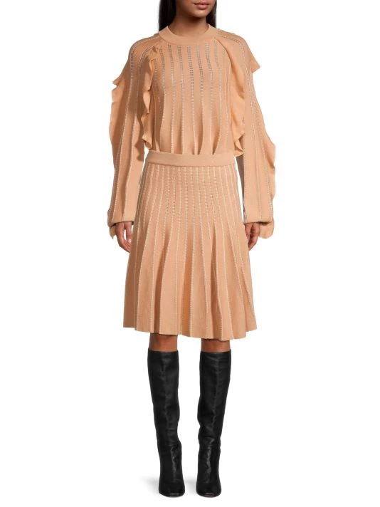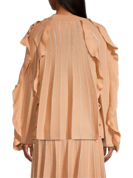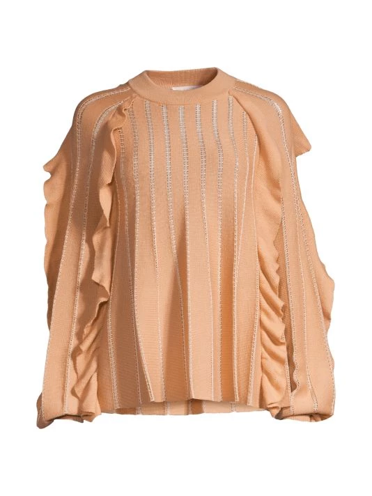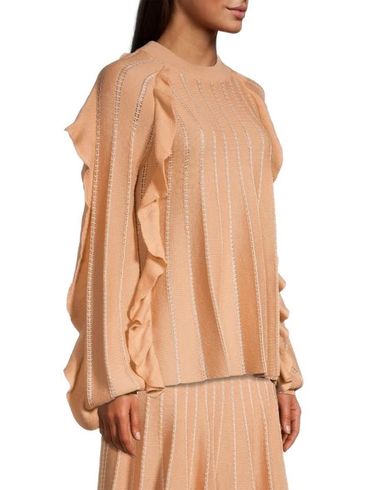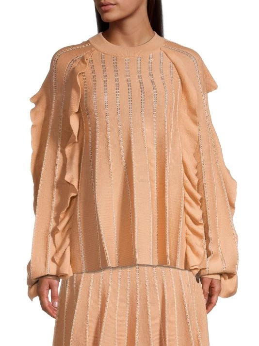 Pullover wool sweater with defined pleated stitching and ruffle detailing at sleeves.