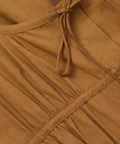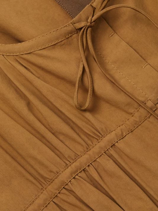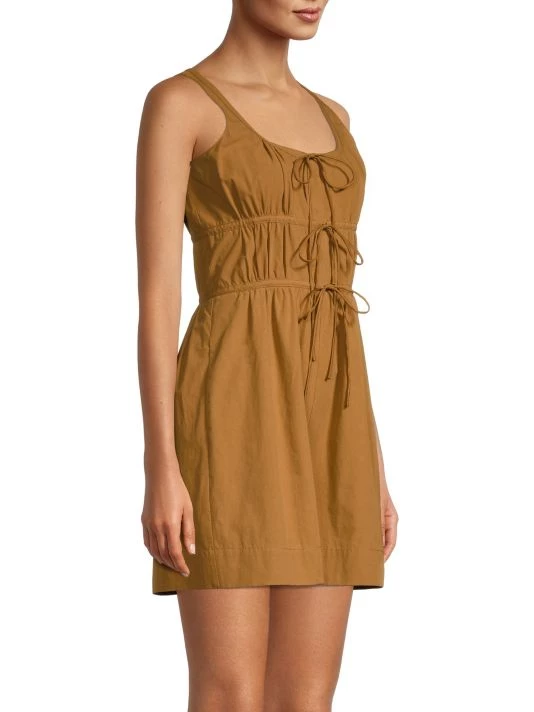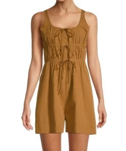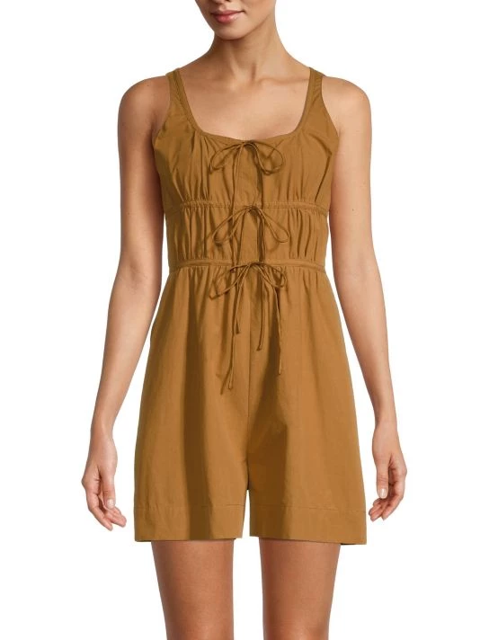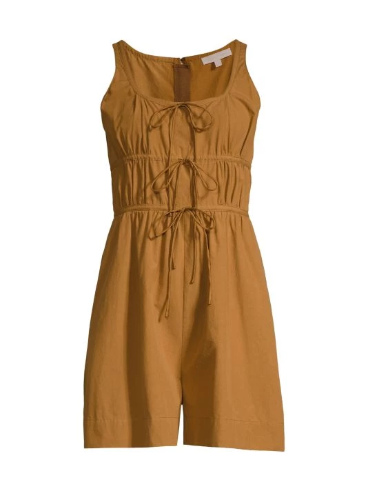 Crisp poplin romper adorned with self-ties on the gathered bodice conceal button placket, paired with tailored wide-leg hem.