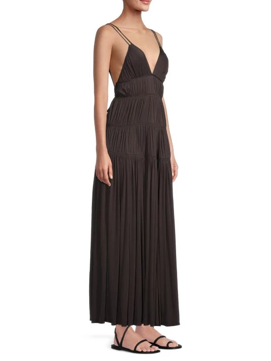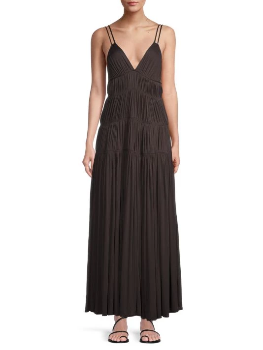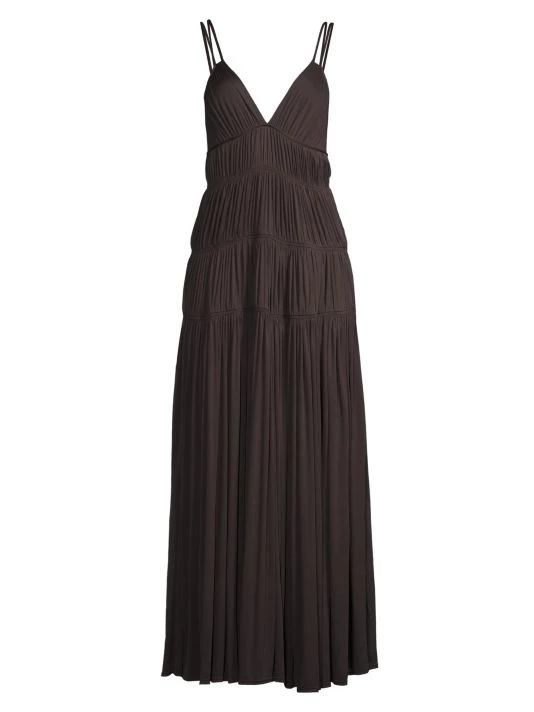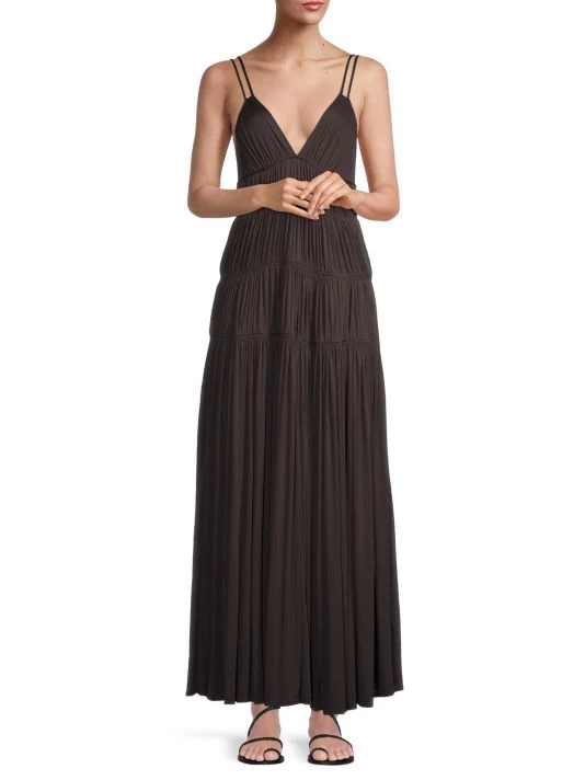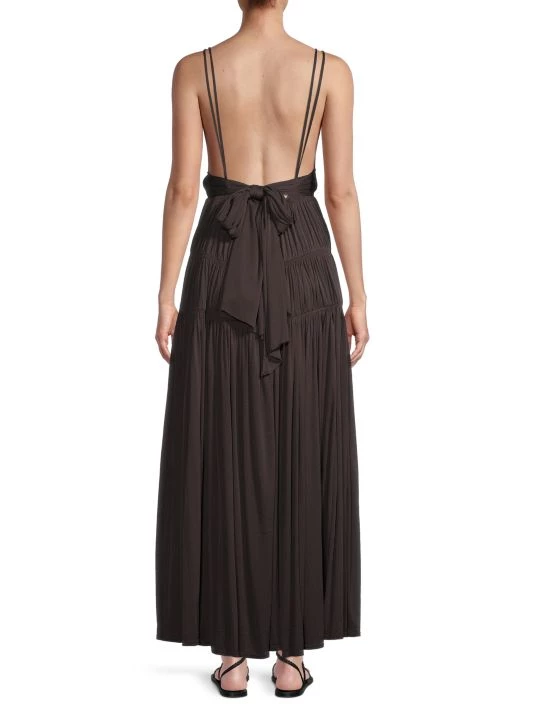 Enhanced with a flattering V-neck, Rebecca Taylor’s maxi dress is designed with ruched detailing that falls into a voluminous skirt. This below-the-knee piece is finished with an oversized tie at the low-cut back.