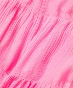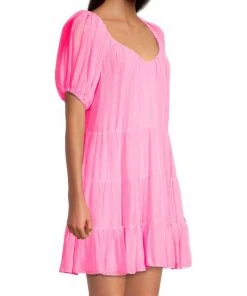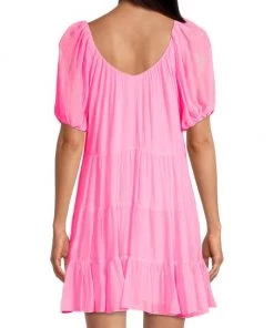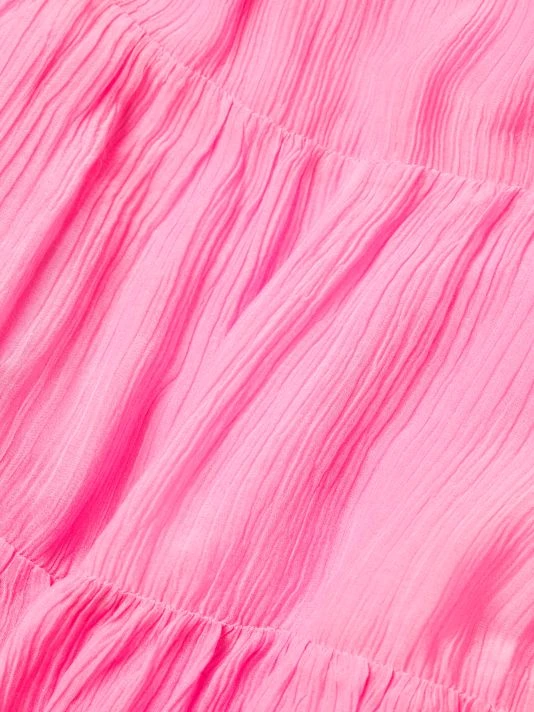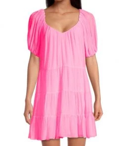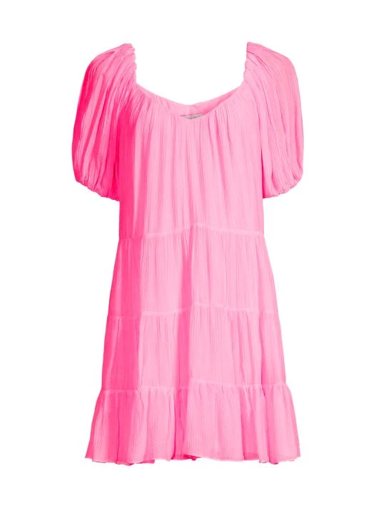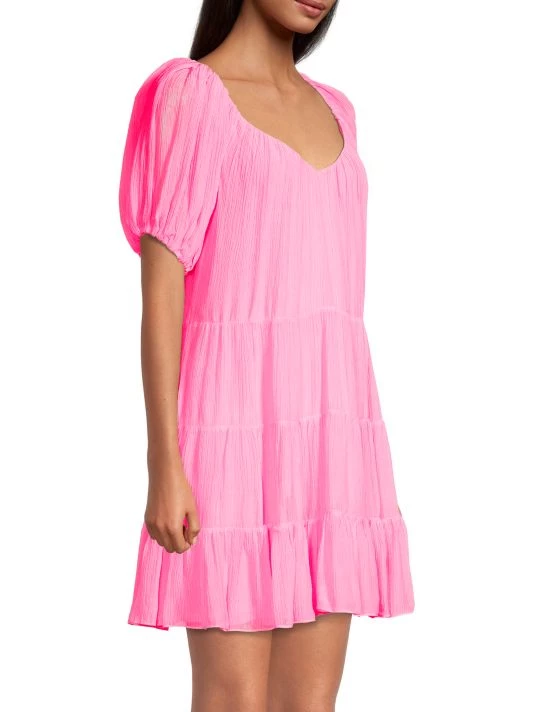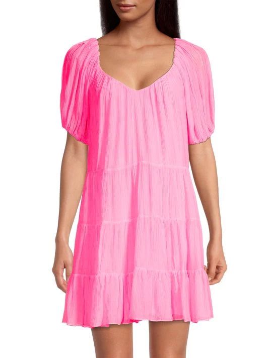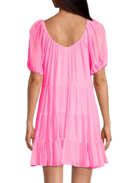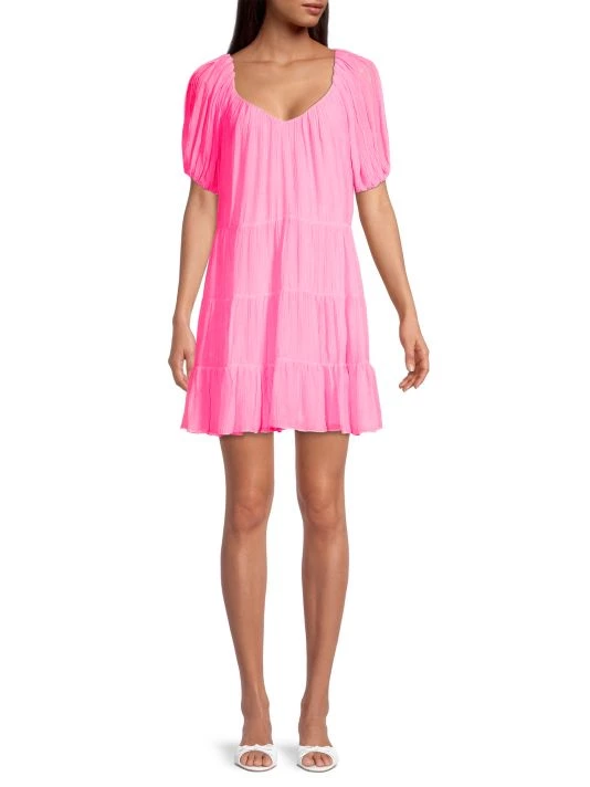 This casual shift dress features a wide V-neckline and relaxed short sleeves, finished in a pleated tier design and mini-length.