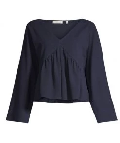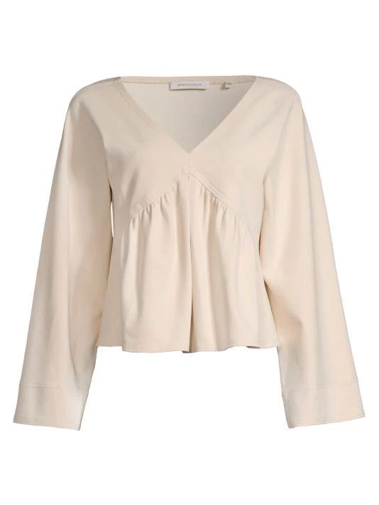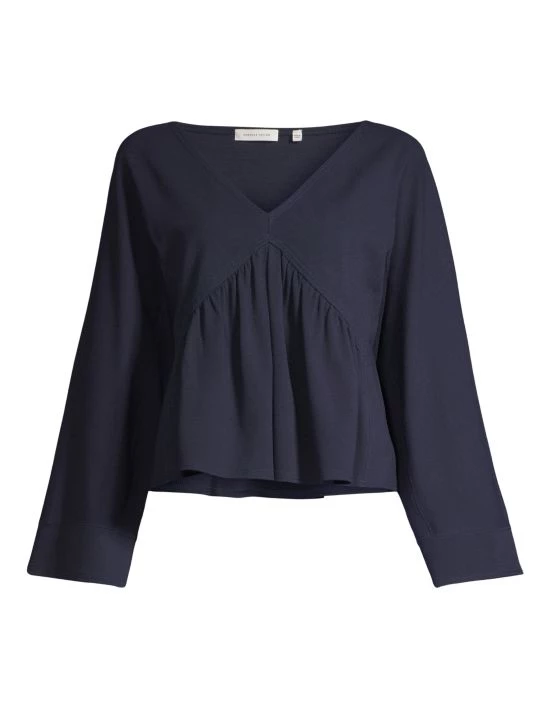 Boxy trapeze pullover top with structured top-stitching and a pleated peplum hem.